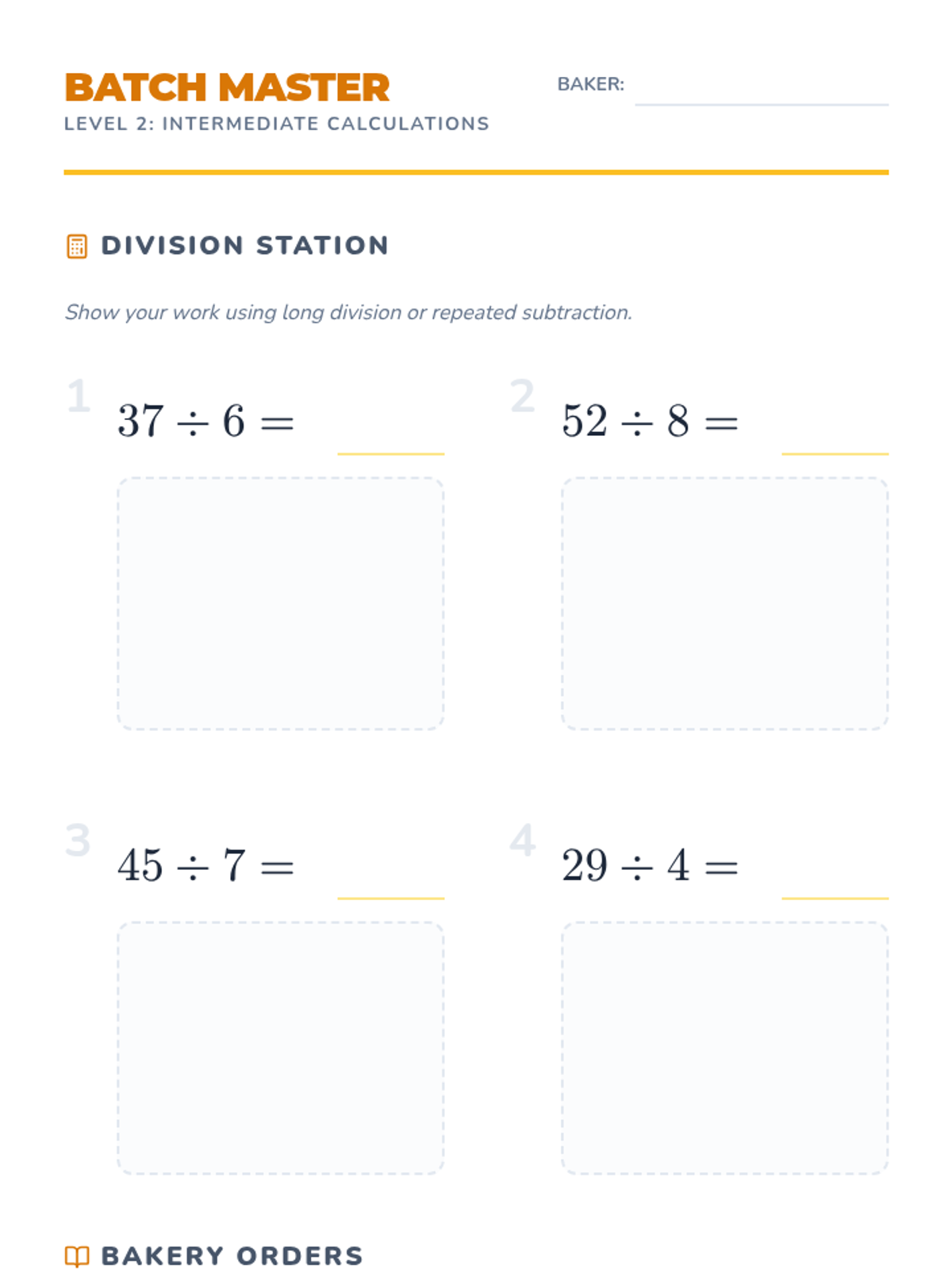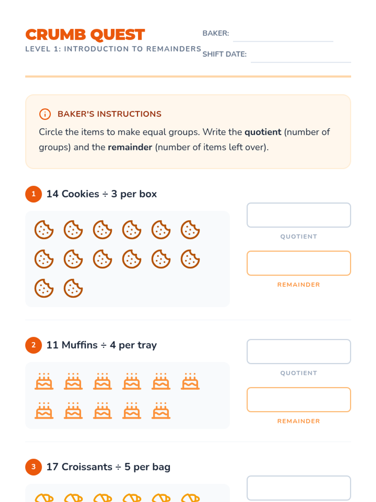 An introductory worksheet (Level 1) for division with remainders, using visual aids and grouping strategies with a bakery theme.