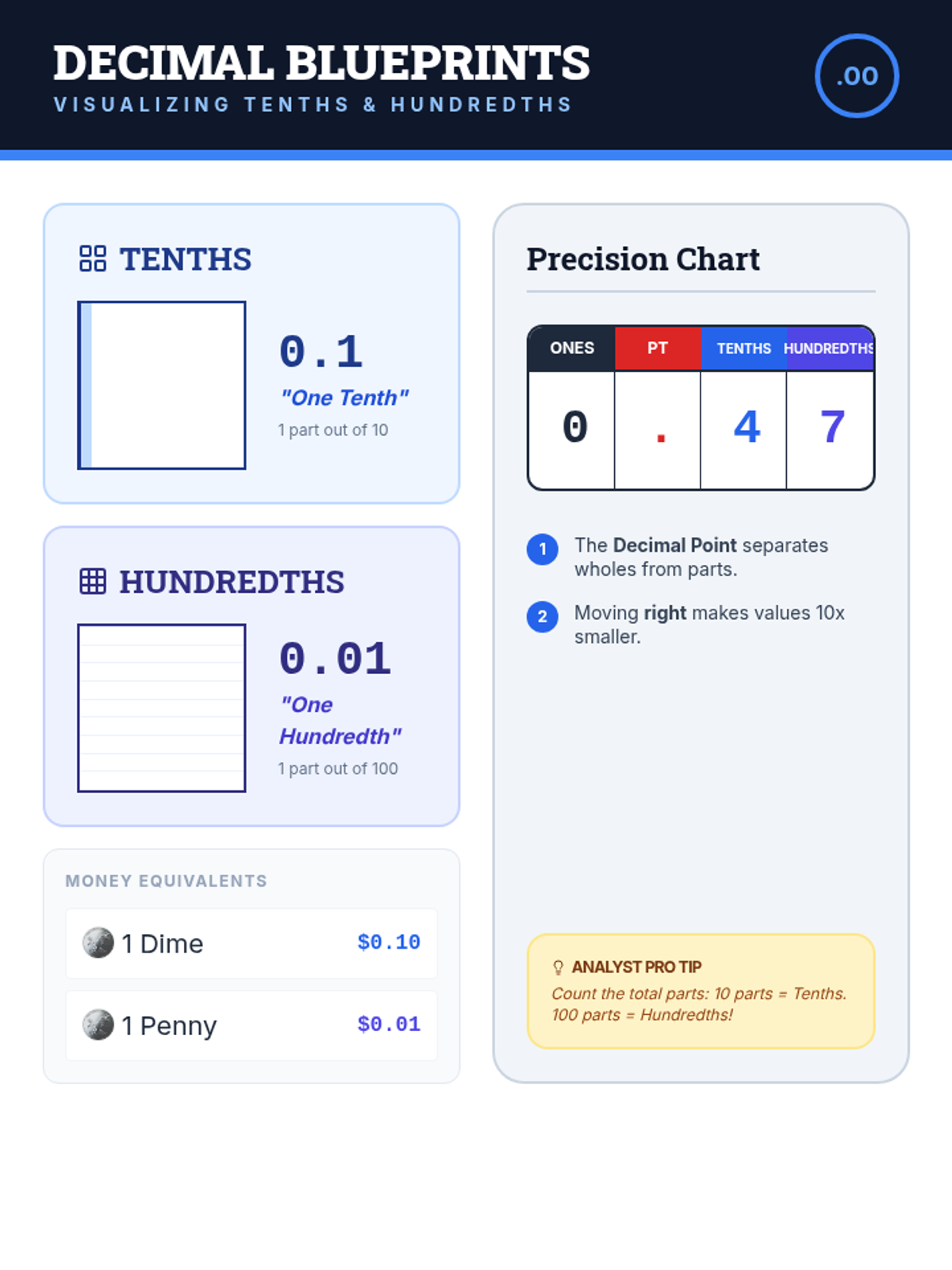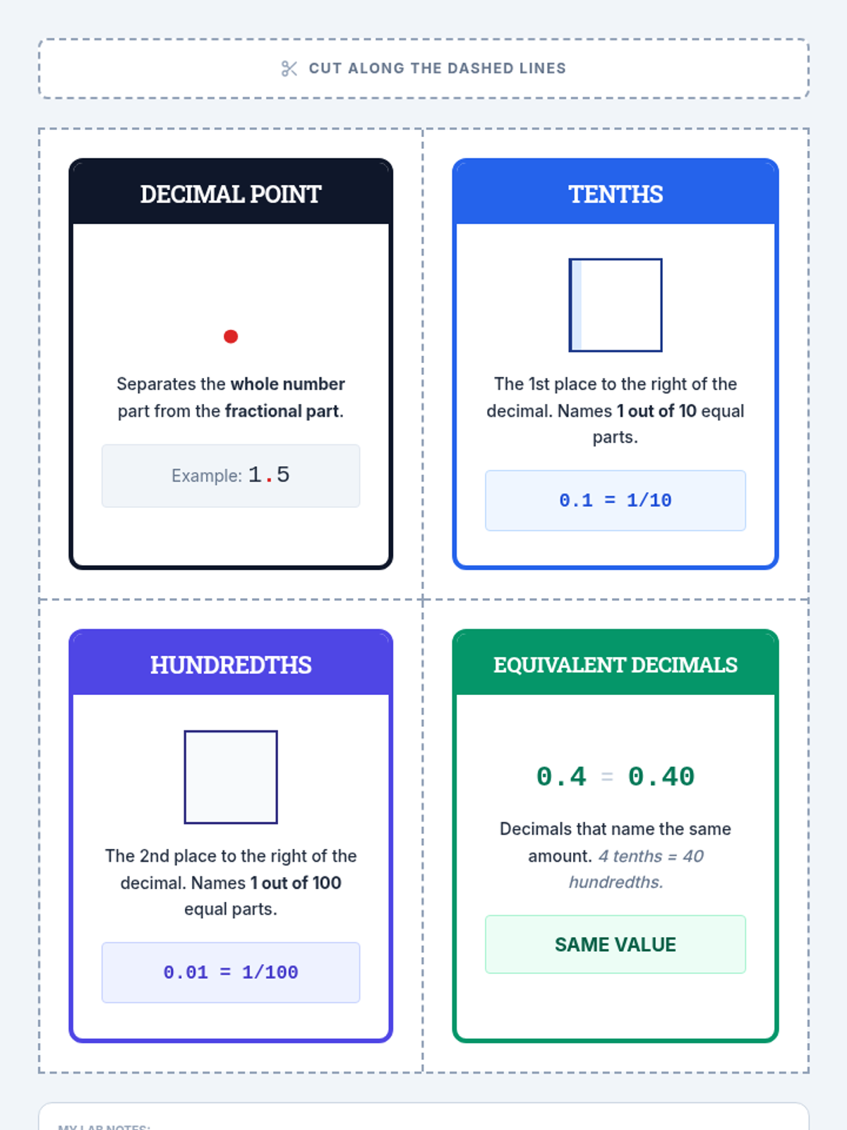 High-contrast vocabulary cards for key decimal terms, including visual representations of tenths and hundredths to support student understanding.