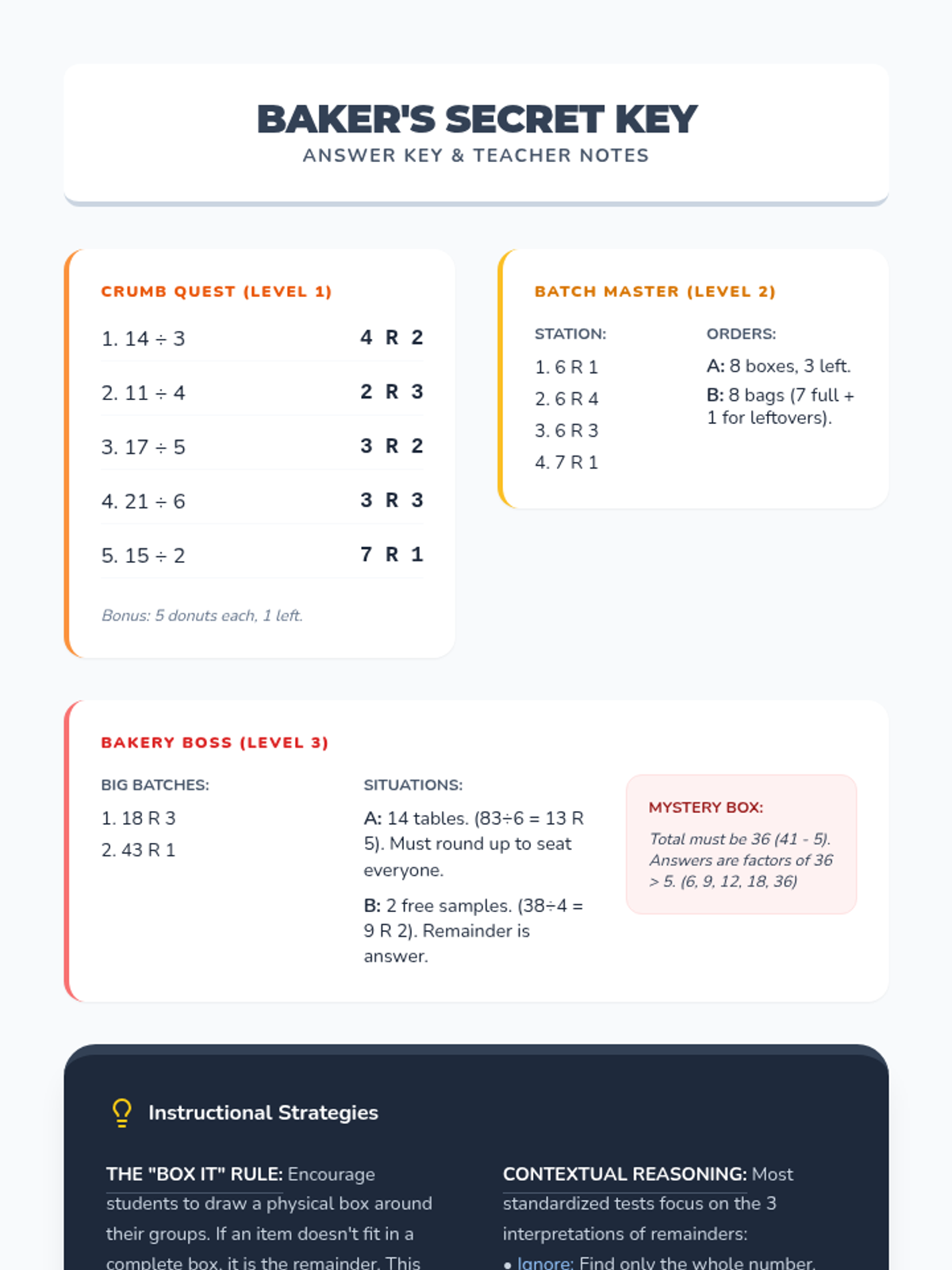 A comprehensive teacher answer key and instructional guide for the "Leftover Loot" division resources.