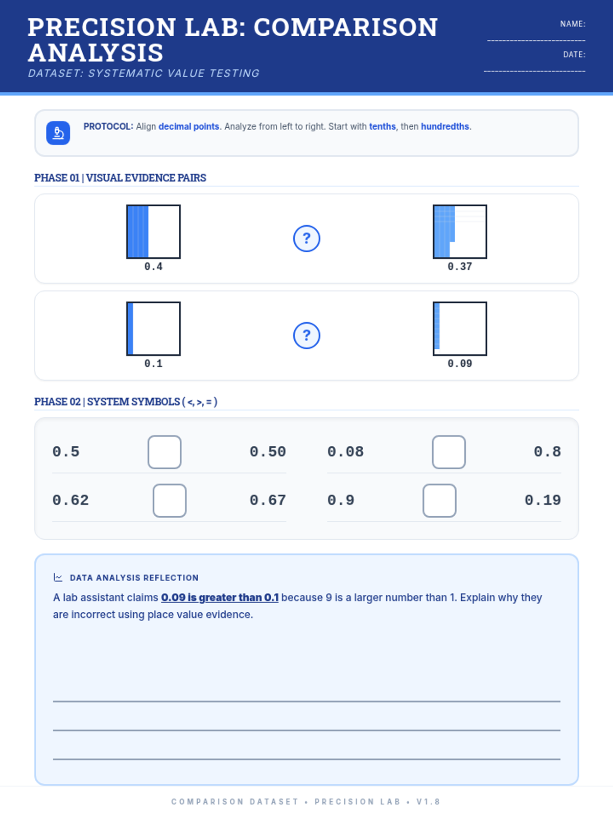 A systematic worksheet for comparing decimals using visual models, symbols (<, >, =), and place value reasoning.