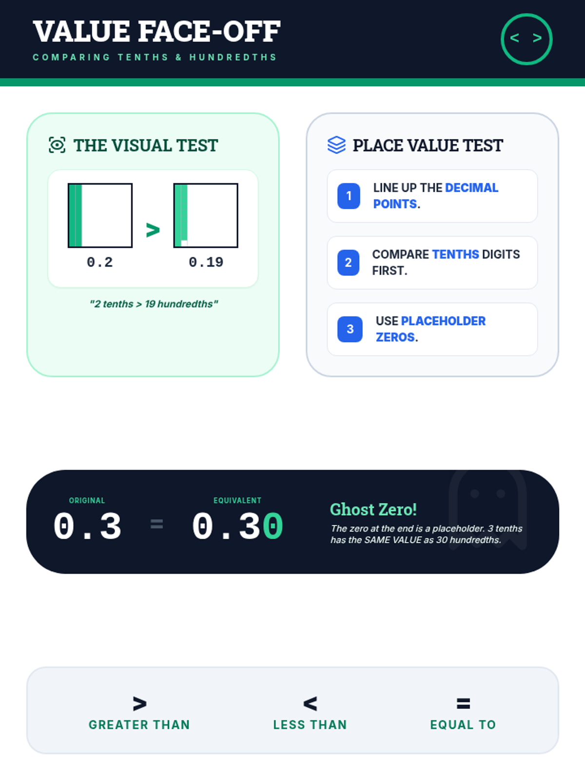 A visually striking anchor chart explaining decimal comparison strategies, featuring visual models for tenths vs hundredths and the "ghost zero" concept.