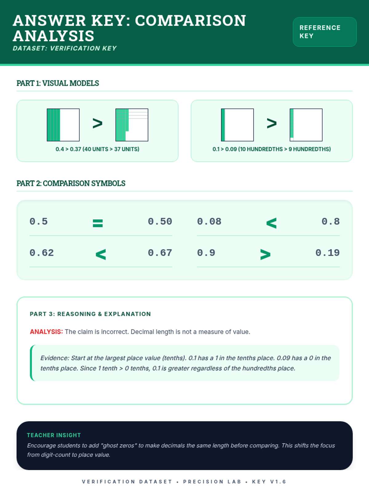 Complete answer key for the Comparison Analysis worksheet, featuring visual proofs and detailed place value reasoning.