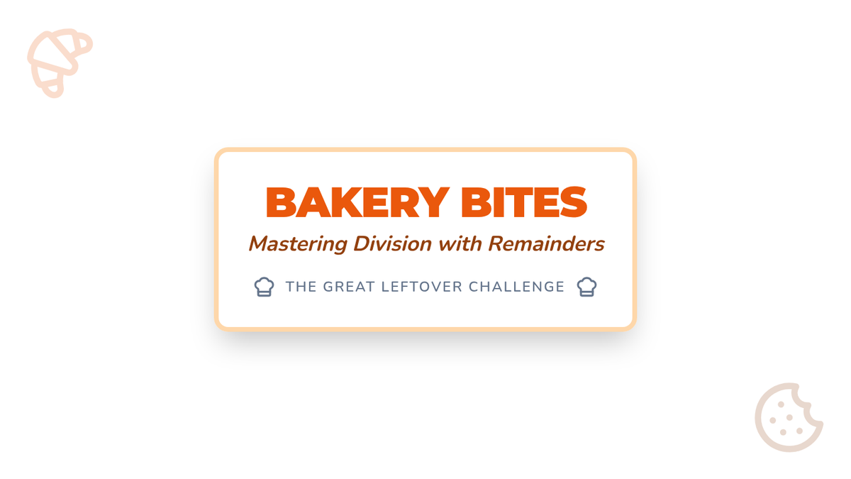 A set of instructional slides teaching division with remainders through a bakery theme, including vocabulary, step-by-step methods, and real-world interpretation.