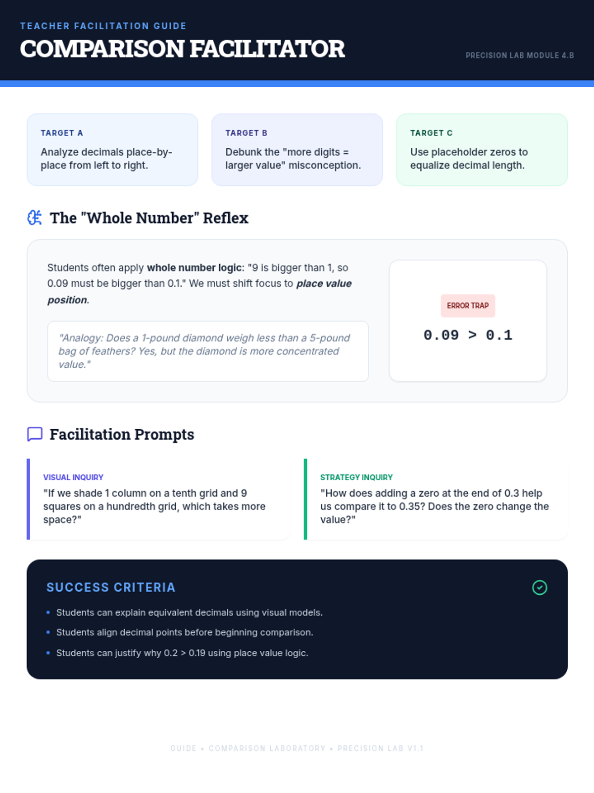 A teacher-facing facilitation guide for teaching decimal comparison, including learning targets, misconception analysis, and discussion prompts.
