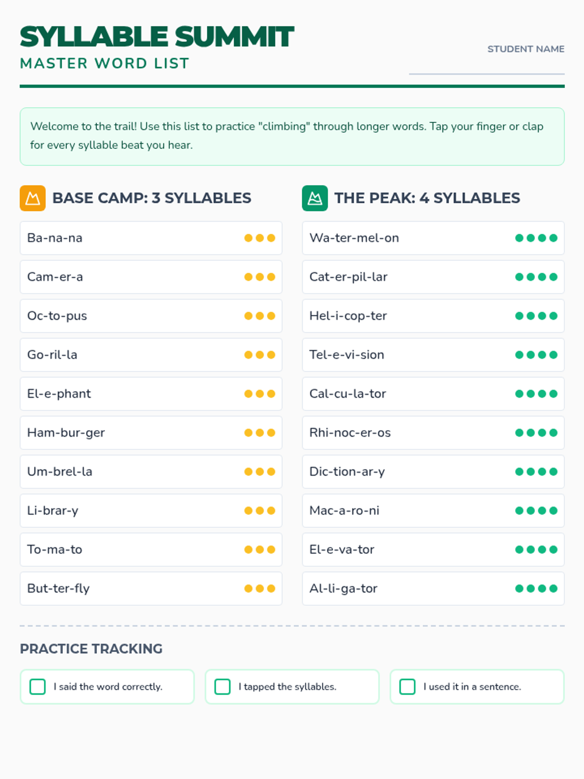 A comprehensive word list featuring 3 and 4-syllable words with visual syllable markers to aid articulation and phonological awareness.
