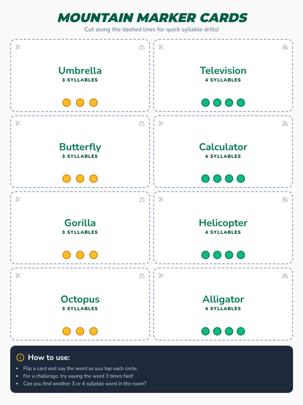 Tactile task cards with visual syllable markers designed for hands-on articulation practice and quick drills.