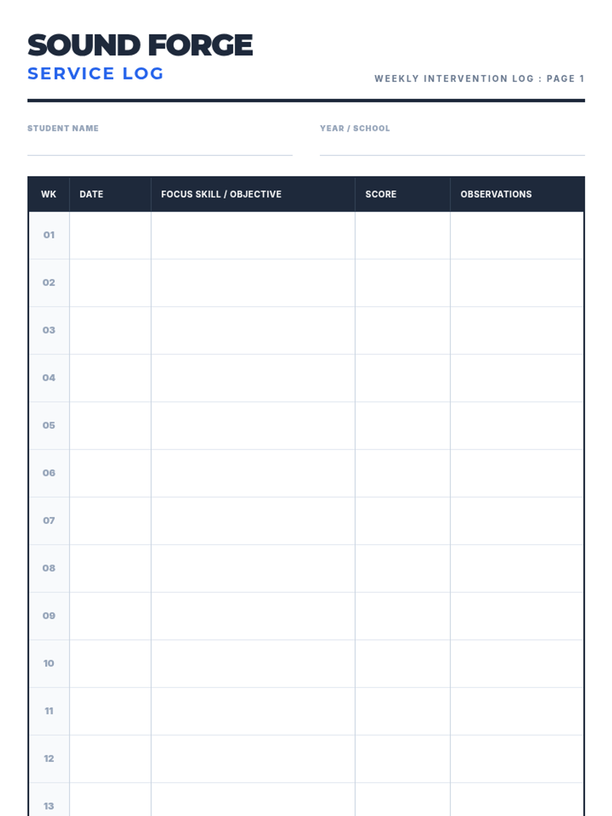 A formal service log for tracking 40 weeks of intervention sessions, including space for dates, objectives, and student performance data.