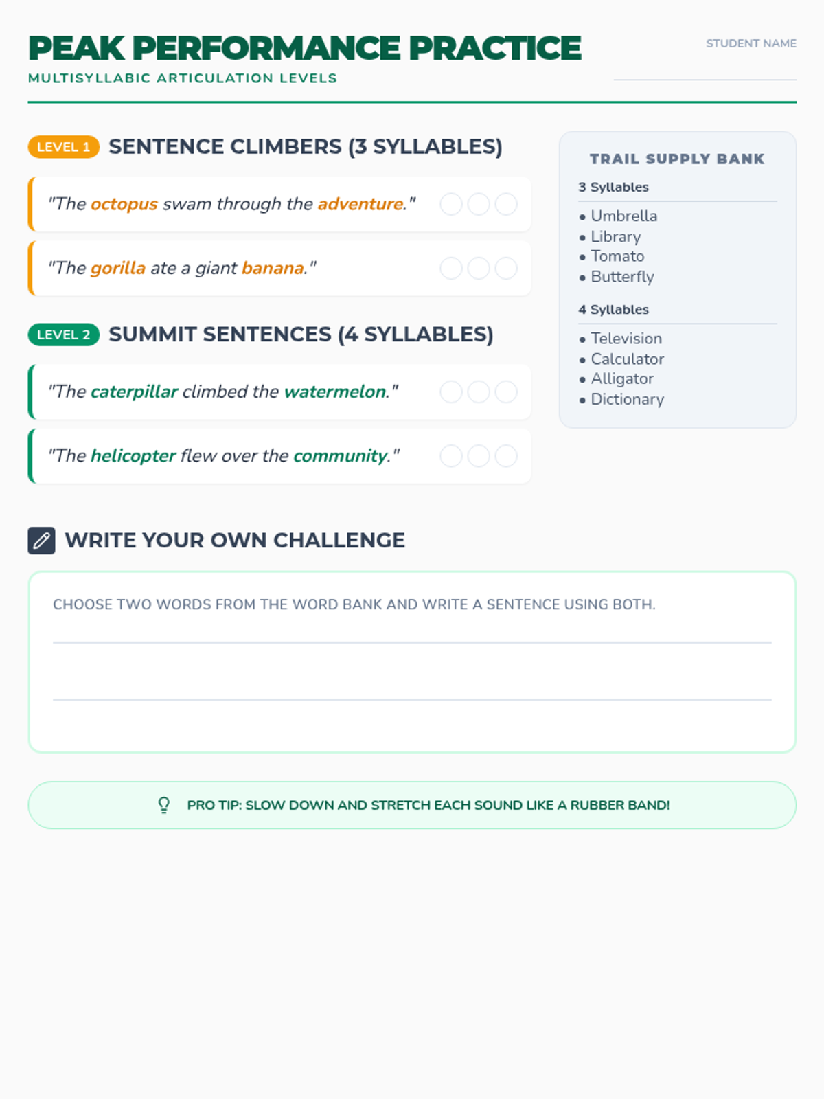 An articulation practice sheet featuring tiered sentence challenges for 3 and 4-syllable words, including tracking markers and a creative writing prompt.