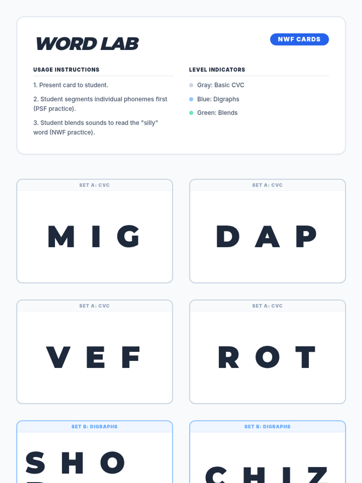 Nonsense word flashcards for NWF practice, categorized by difficulty (CVC, digraphs, and blends) to support decoding and recoding skills.