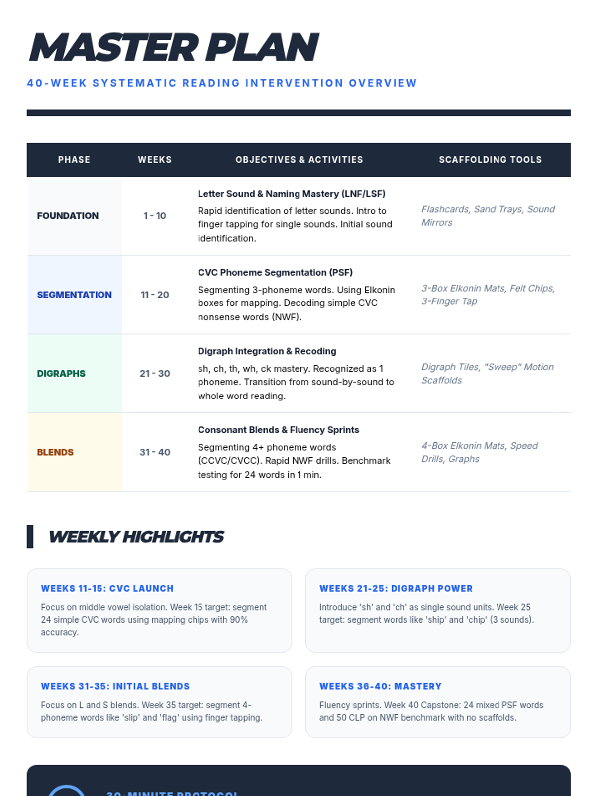 A 40-week master plan for reading intervention, outlining quarterly goals, weekly focuses, and specific scaffolding tools for PSF and NWF.