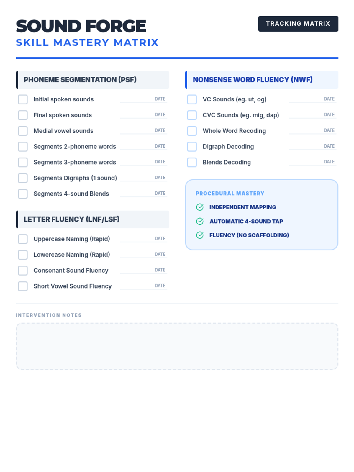A comprehensive skill checklist for assessing student progress in PSF and NWF, covering letter naming, phoneme segmentation, and decoding levels.