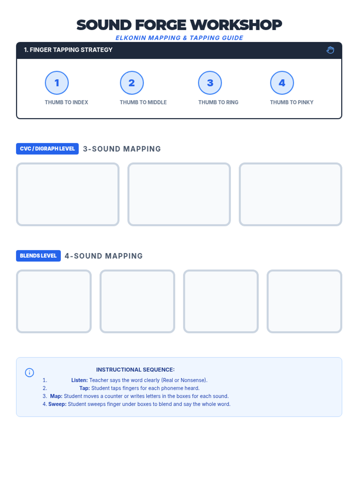 Instructional workshop mats featuring 3- and 4-sound Elkonin boxes and a visual finger-tapping guide for phoneme segmentation scaffolding.