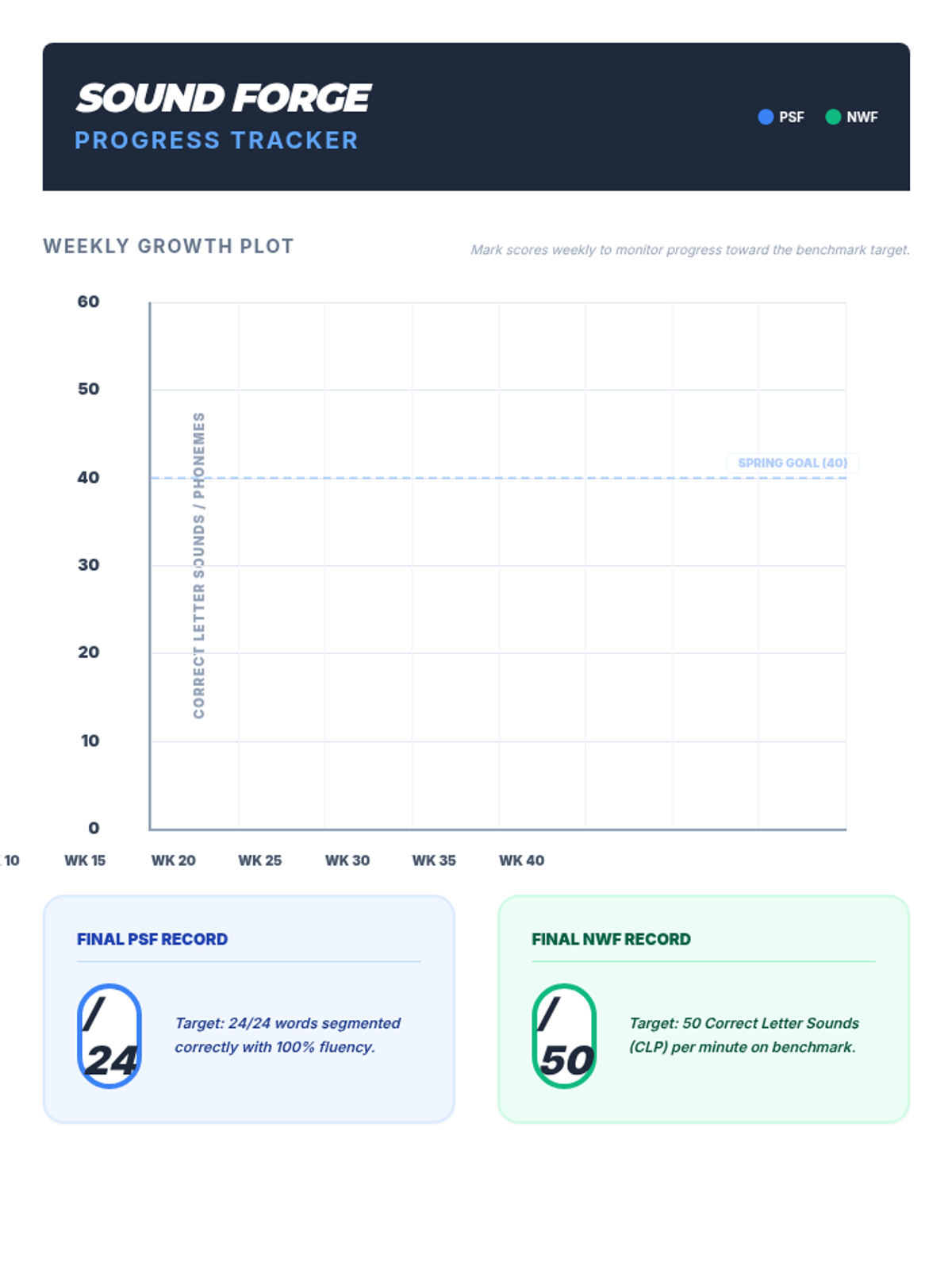 A visual progression chart for tracking growth in Phoneme Segmentation Fluency (PSF) and Nonsense Word Fluency (NWF) over 40 weeks, including milestone goals.
