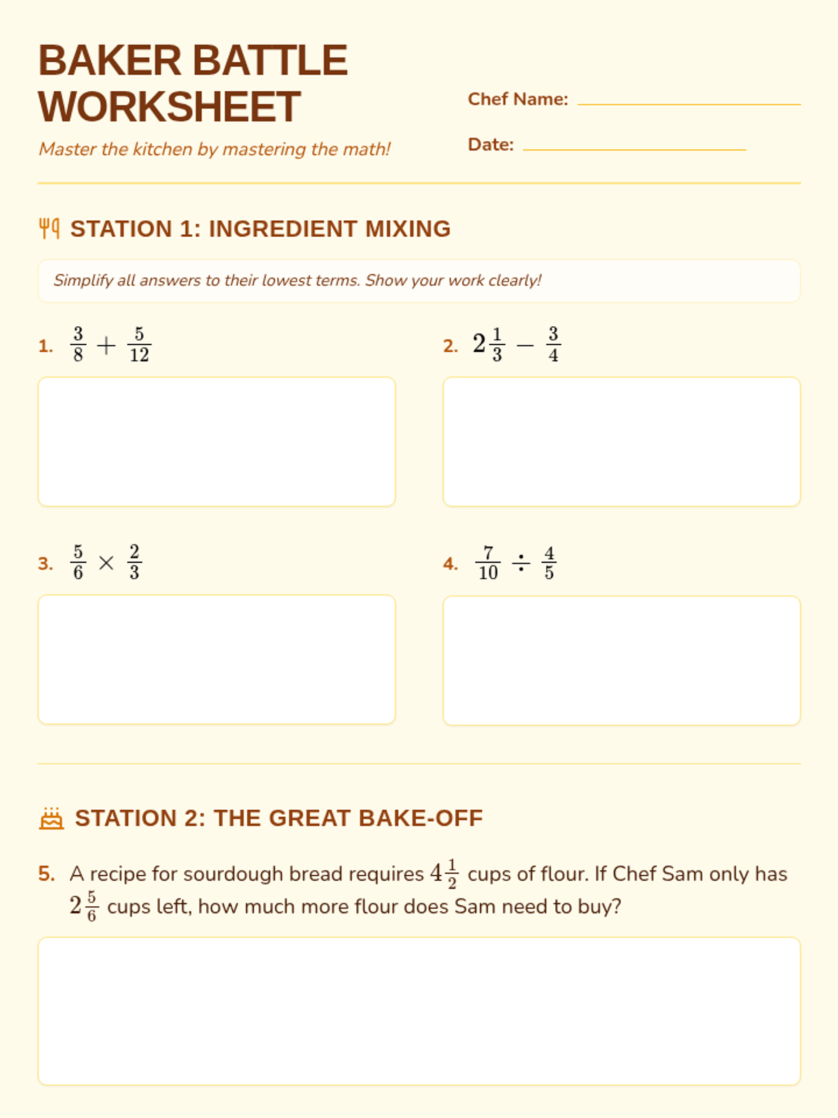 A culinary-themed worksheet for 7th-grade students featuring four operations with fractions through computational exercises and real-world word problems.