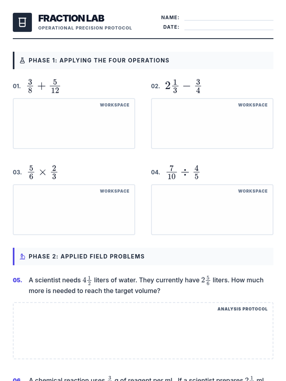 A clean, laboratory-themed worksheet for 7th-grade students featuring four operations with fractions through systematic computational exercises and field-based word problems.