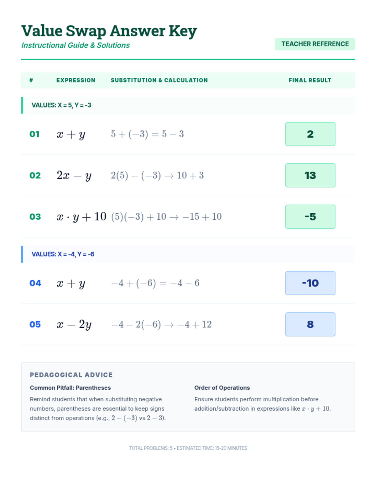 An answer key for the Value Swap Worksheet providing full solutions and step-by-step substitution for teacher reference.