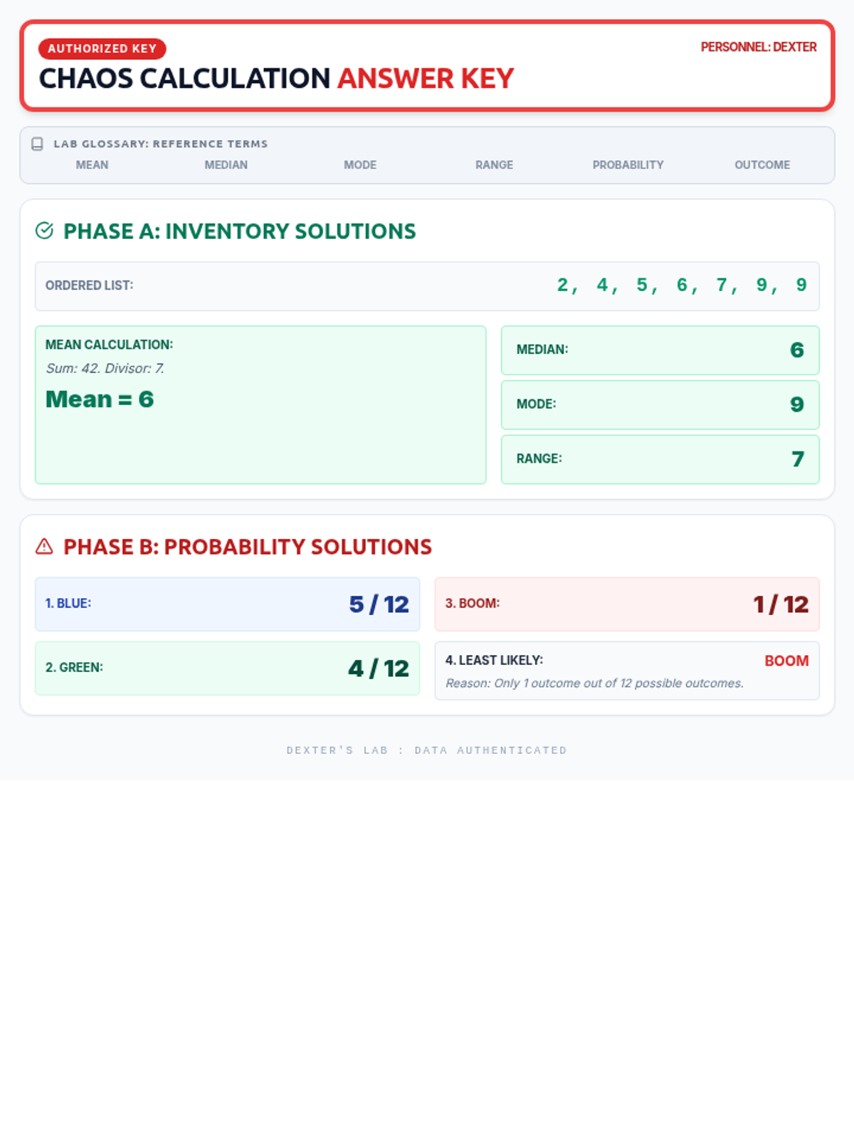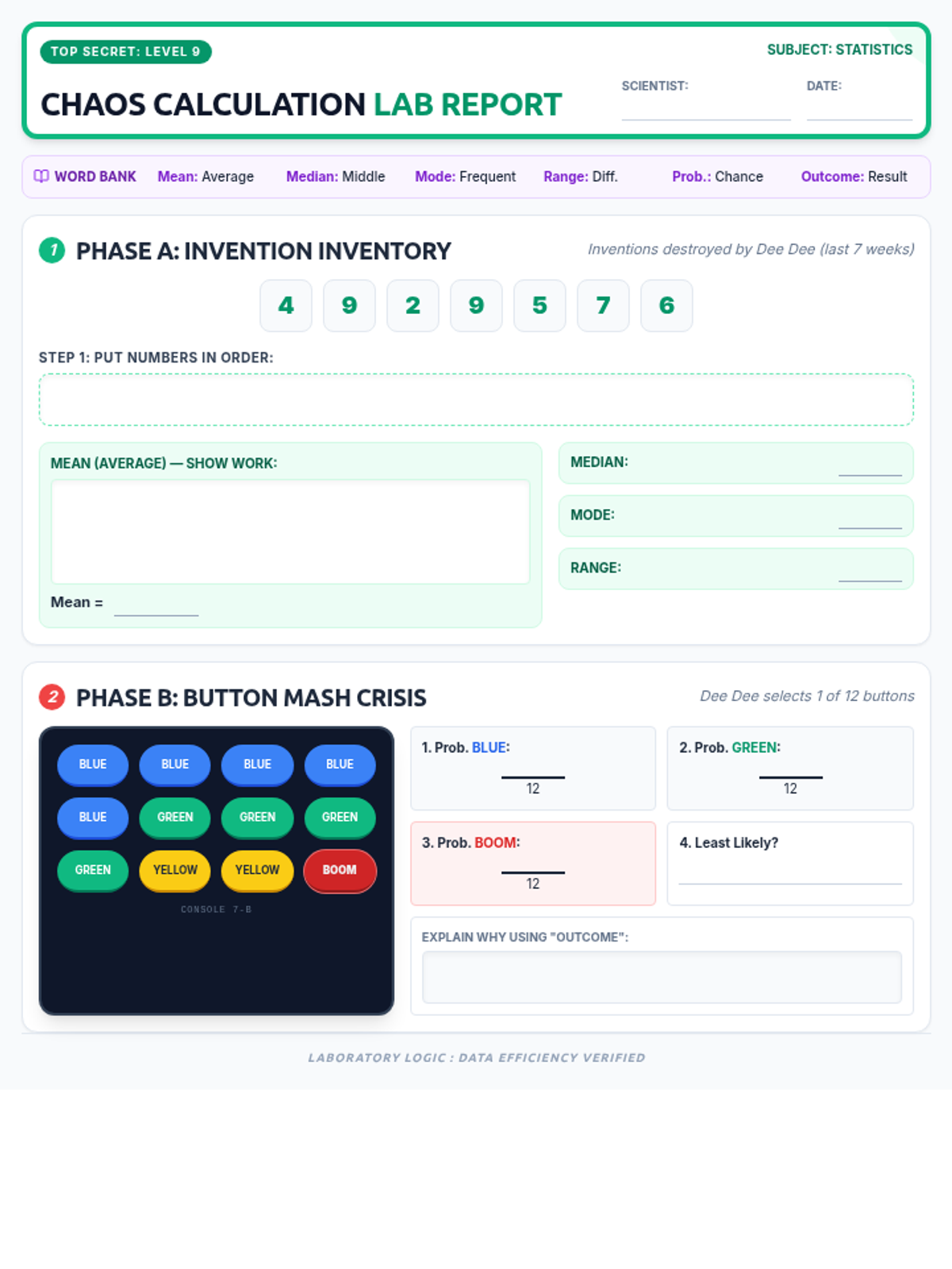 A highly visual single-page statistics worksheet for freshman students, themed around Dexter's Laboratory. Covers Mean, Median, Mode, Range, and basic Probability with a laboratory-inspired design and compact layout.