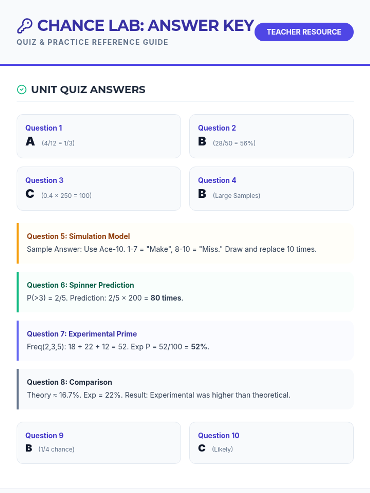 A comprehensive answer key and teacher reference guide for the Chance Lab probability unit, containing correct responses for the quiz, guided notes, and independent practice problems.