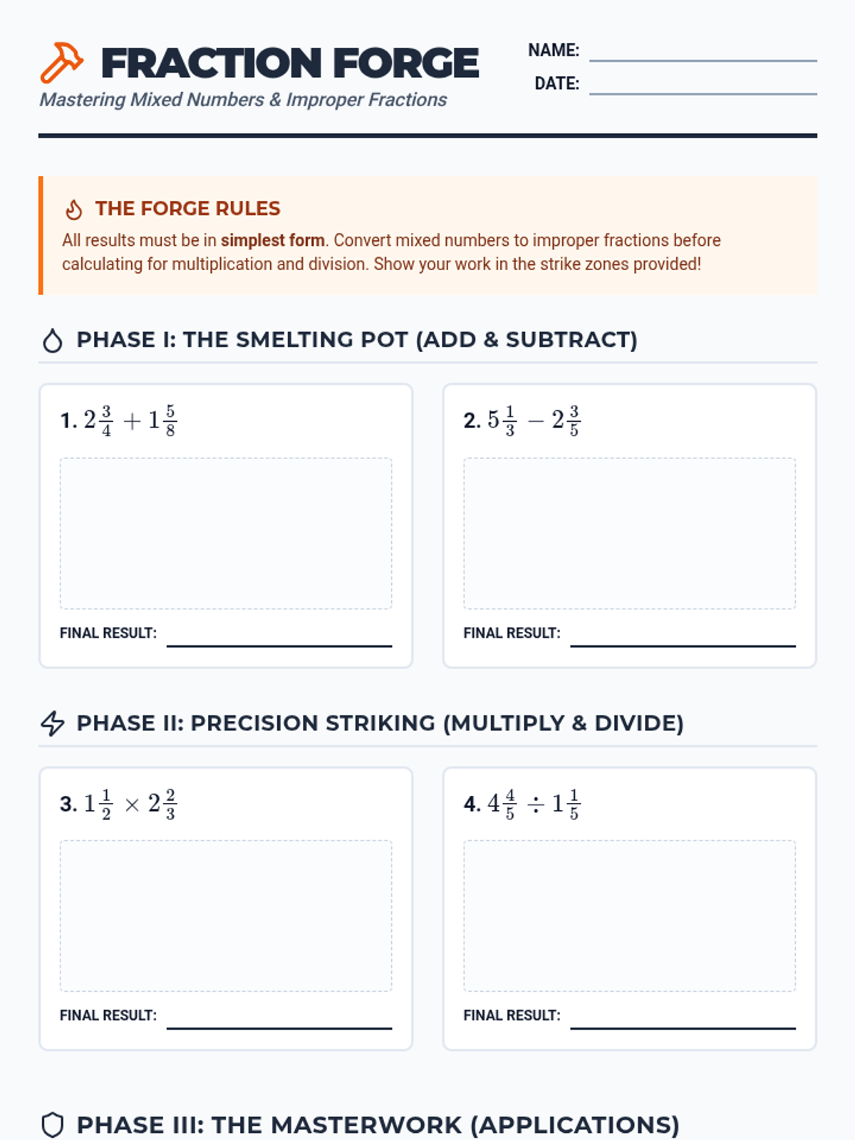 A high-quality 7th-grade math worksheet featuring a "Fraction Forge" theme. It includes practice problems for all four operations with mixed numbers and improper fractions, plus real-world application word problems.