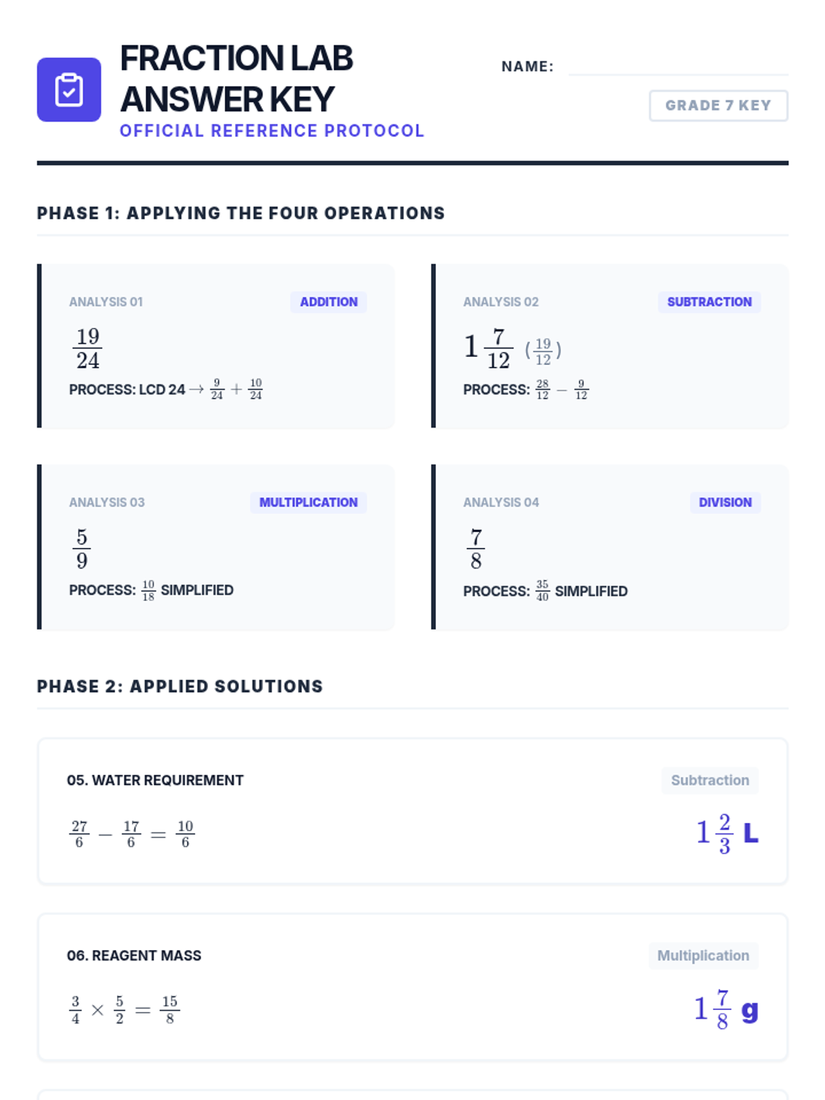 Complete answer key for the Fraction Lab Worksheet, providing detailed computational steps and final validation protocols for all lab-based problems.