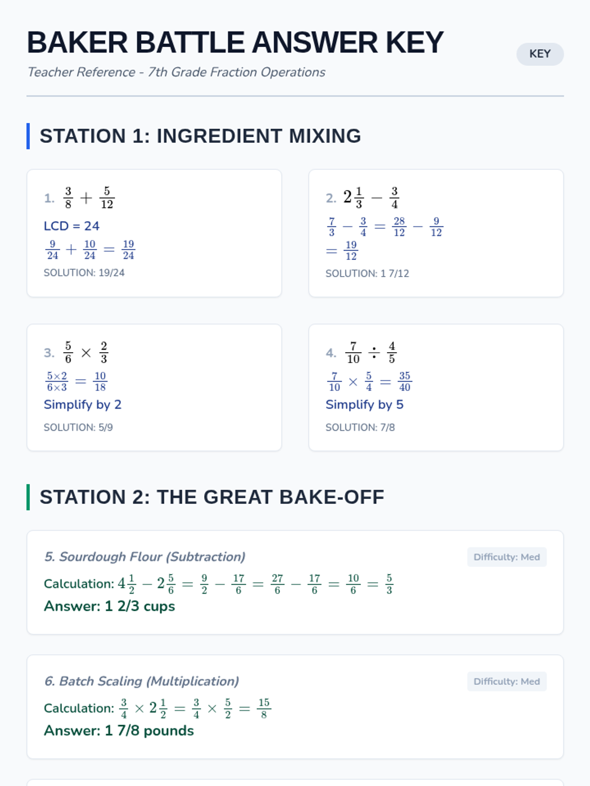 Complete answer key for the Baker Battle Worksheet, providing step-by-step solutions for computational and word problems involving fraction operations.