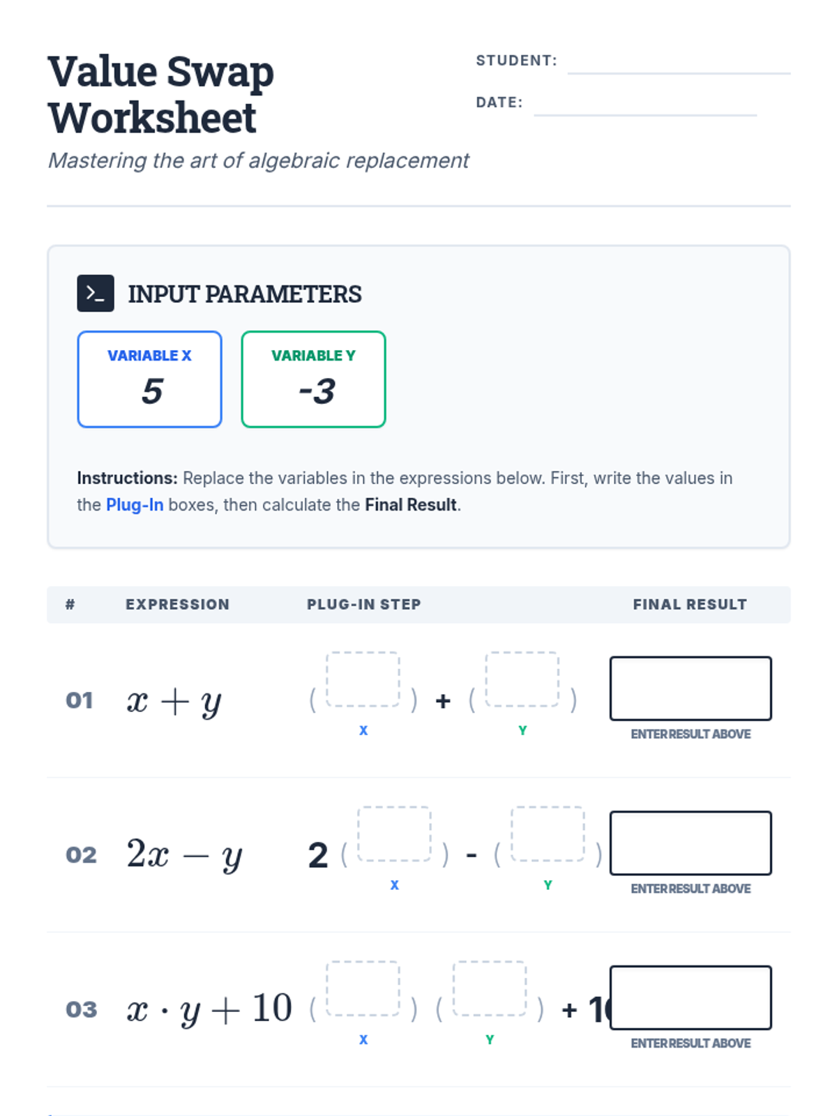 A basic substitution worksheet where students replace variables x and y with given positive and negative integers using a scaffolded plug-in format.