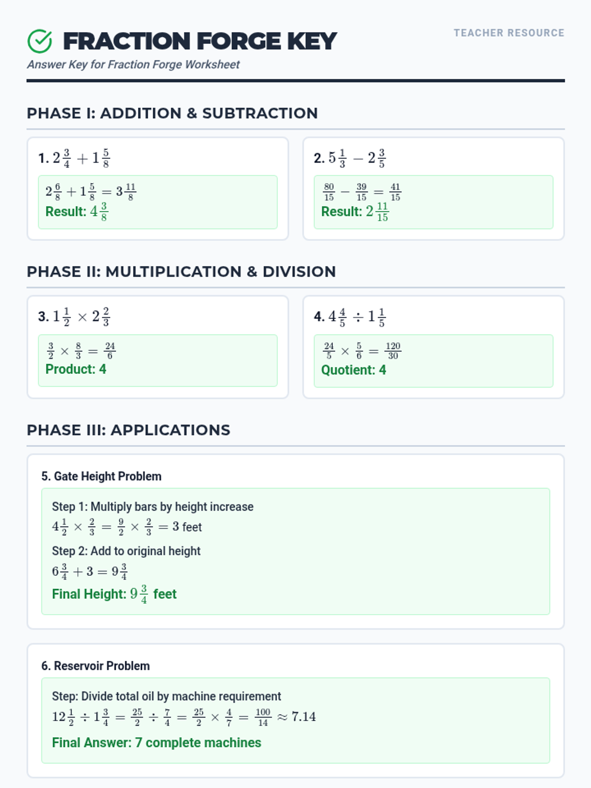 A comprehensive answer key for the Fraction Forge Worksheet, providing step-by-step solutions for mixed number operations and word problems.