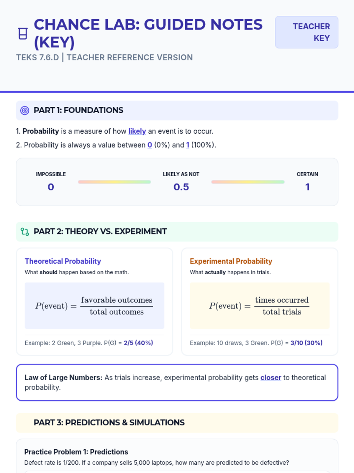 A comprehensive slide deck for reviewing theoretical and experimental probability, simulations, and predictions, featuring clear definitions, visual examples, and practice problems aligned with TEKS 7.6.D.