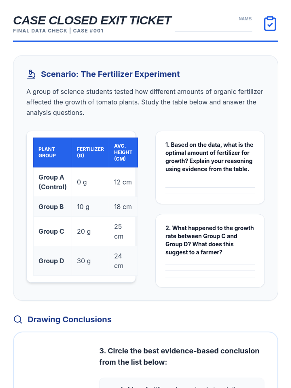 Final assessment for the lesson, requiring students to interpret a data table and draw a specific conclusion about an experiment's results.