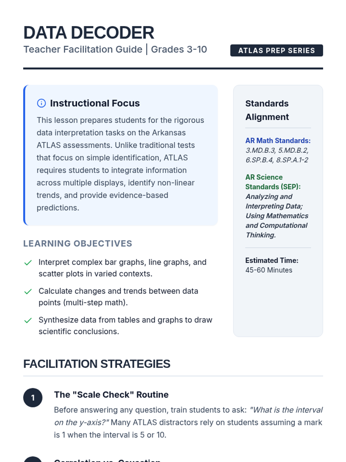 Comprehensive facilitator guide providing instructional strategies, standards alignment for Arkansas (math/science), and a detailed answer key with rationales for the lesson's materials.