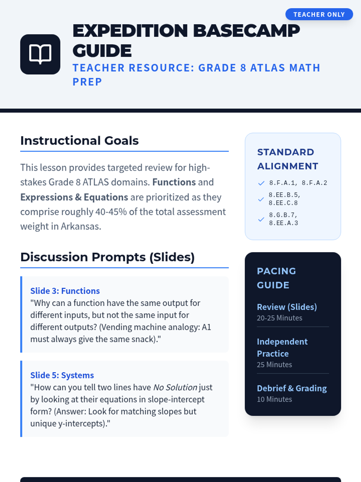 A guide for teachers including instructional objectives, slide discussion prompts, standard alignment, and a complete answer key for the ATLAS Grade 8 practice test.