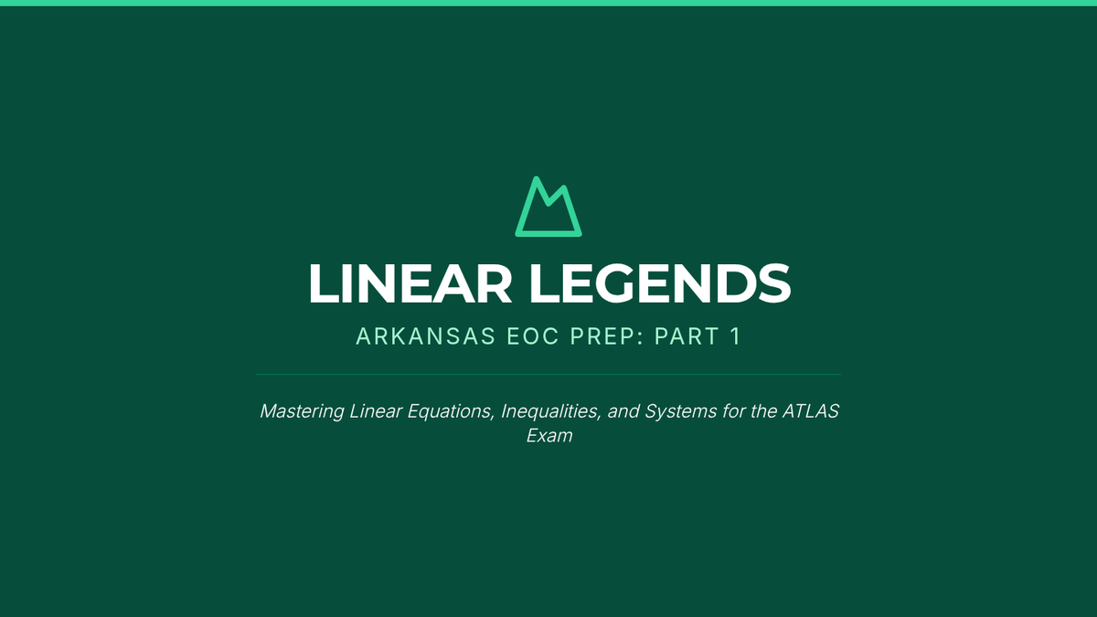 A 16:9 slide presentation for Algebra I EOC prep, focusing on linear equations, inequalities, and systems. Features Arkansas ATLAS-style question formats and real-world hike scenarios with a professional 'Natural State Explorer' theme. Revised for better contrast and fixed rendering issues.