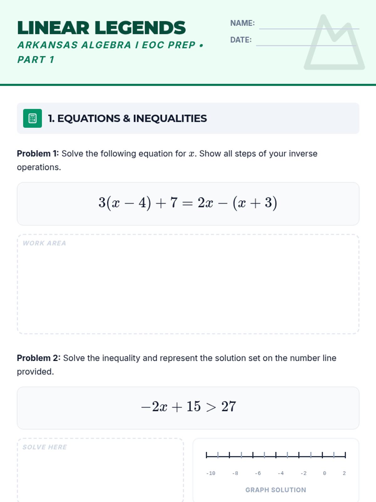 A printable 2-page student worksheet for Algebra I EOC prep. Includes multi-step equations, inequalities with a number line, a real-world graphing scenario (kayak rentals), and a wildlife-themed systems word problem. Built for 8th and 9th grade students. Revised for better contrast and printer-friendliness.