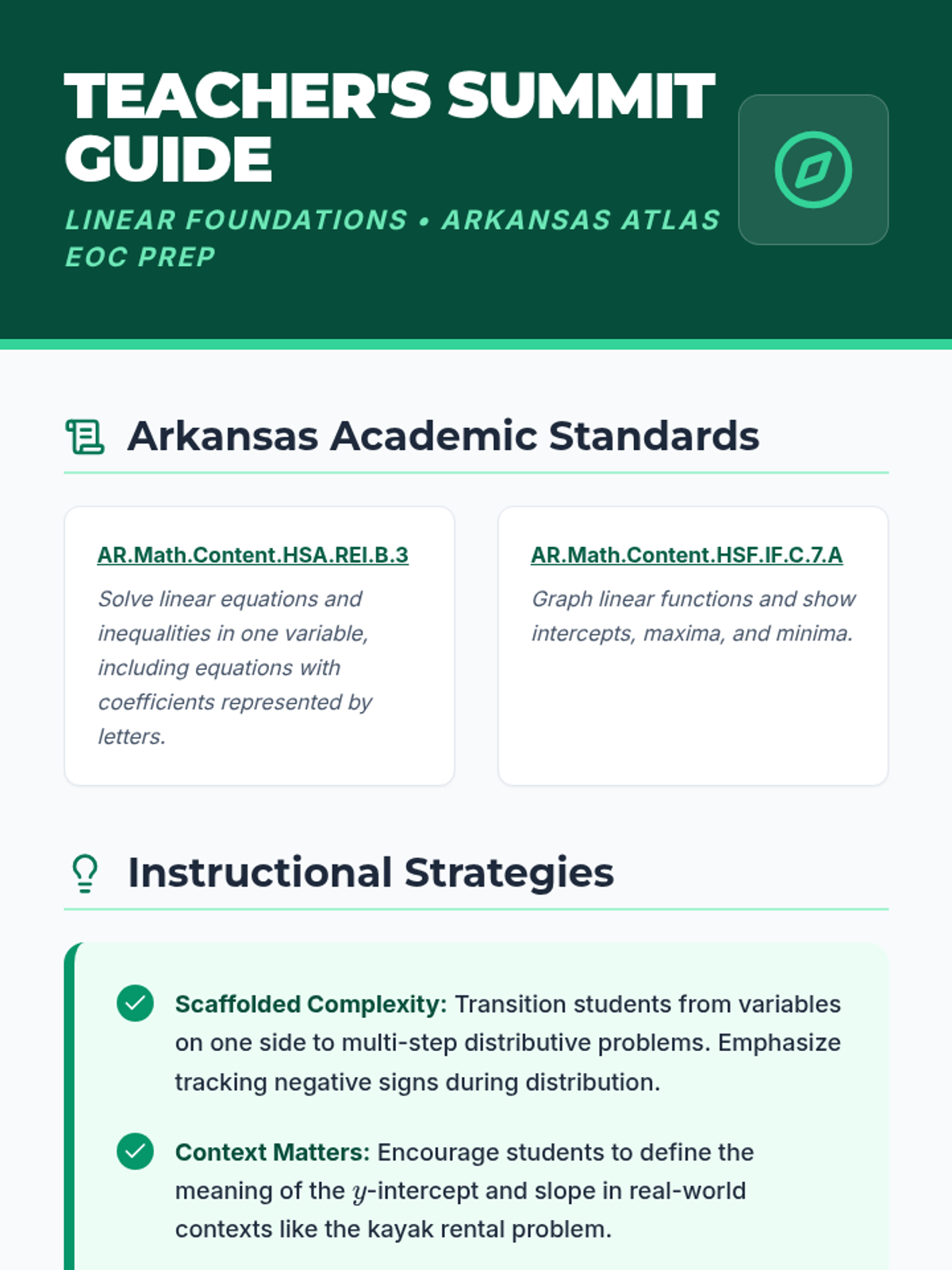 A teacher facilitation guide for the Linear Legends lesson. Includes Arkansas Algebra I standards alignment, instructional strategies for 8th and 9th graders, and a detailed answer key with potential student misconceptions flagged. Fixed page breaks and LaTeX rendering issues.