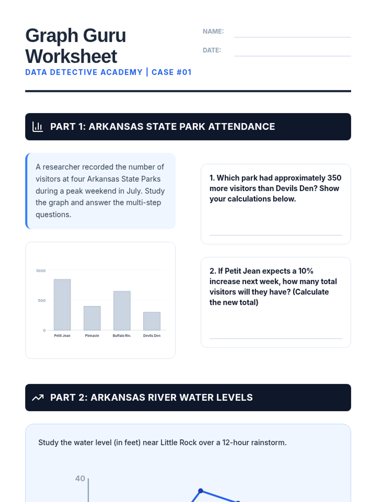 Student practice worksheet featuring Arkansas-themed data scenarios for bar graphs, line graphs, and scatter plots, designed to build multi-step interpretation skills.