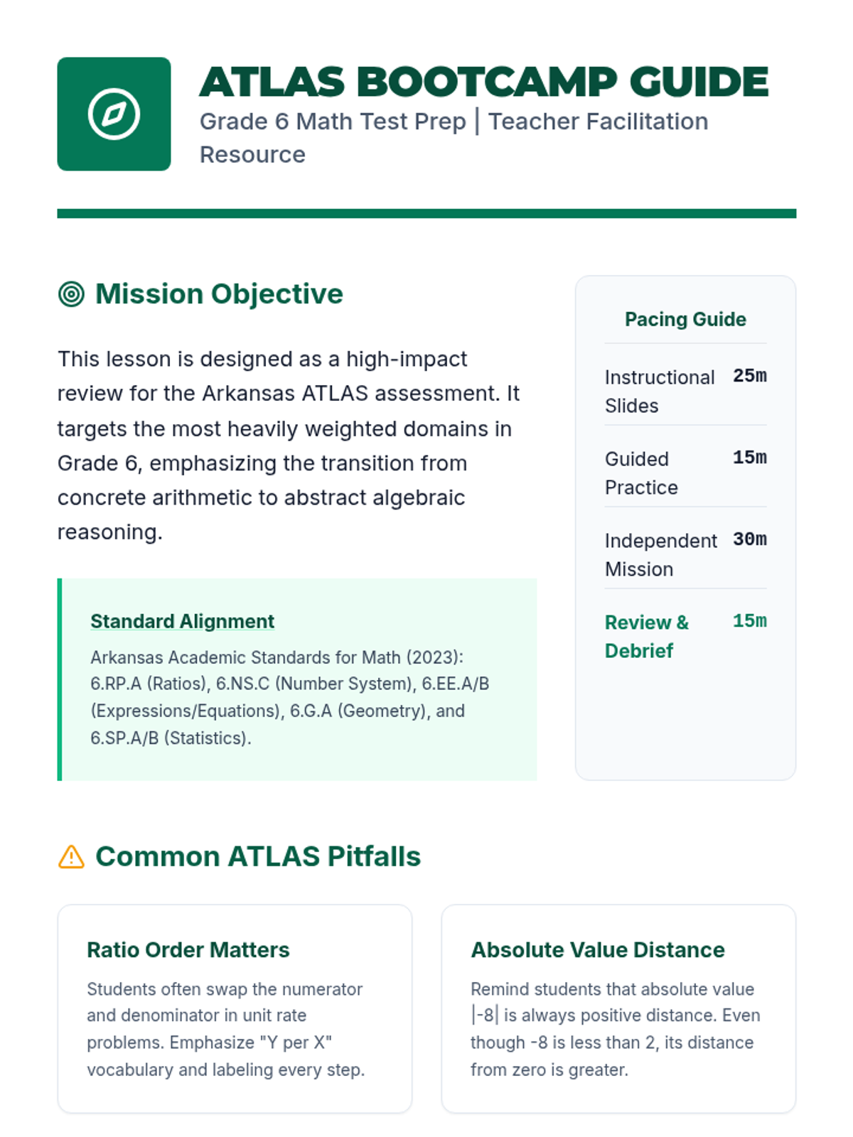 A comprehensive teacher guide for facilitating the Grade 6 ATLAS Math Bootcamp. Includes pacing guides, standard alignments, common student misconceptions, and high-level discussion prompts. Revised to ensure mathematical notation renders correctly and sections remain cohesive across pages. Corrected footer positioning.