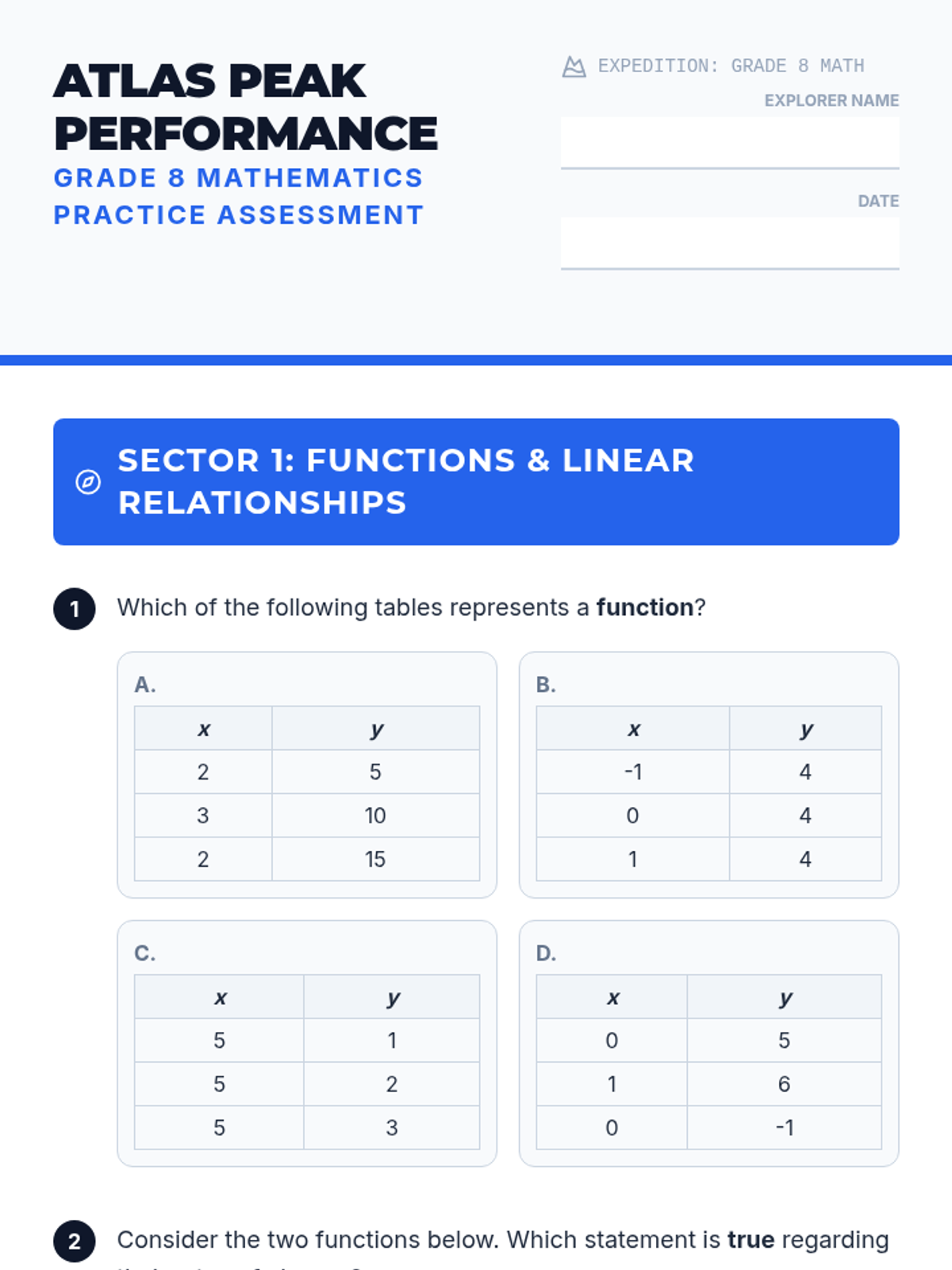 A Grade 8 Math practice assessment aligned to the Arkansas ATLAS standards. It features items on functions, linear equations, systems, the Pythagorean theorem, and scientific notation with a consistent expedition theme.