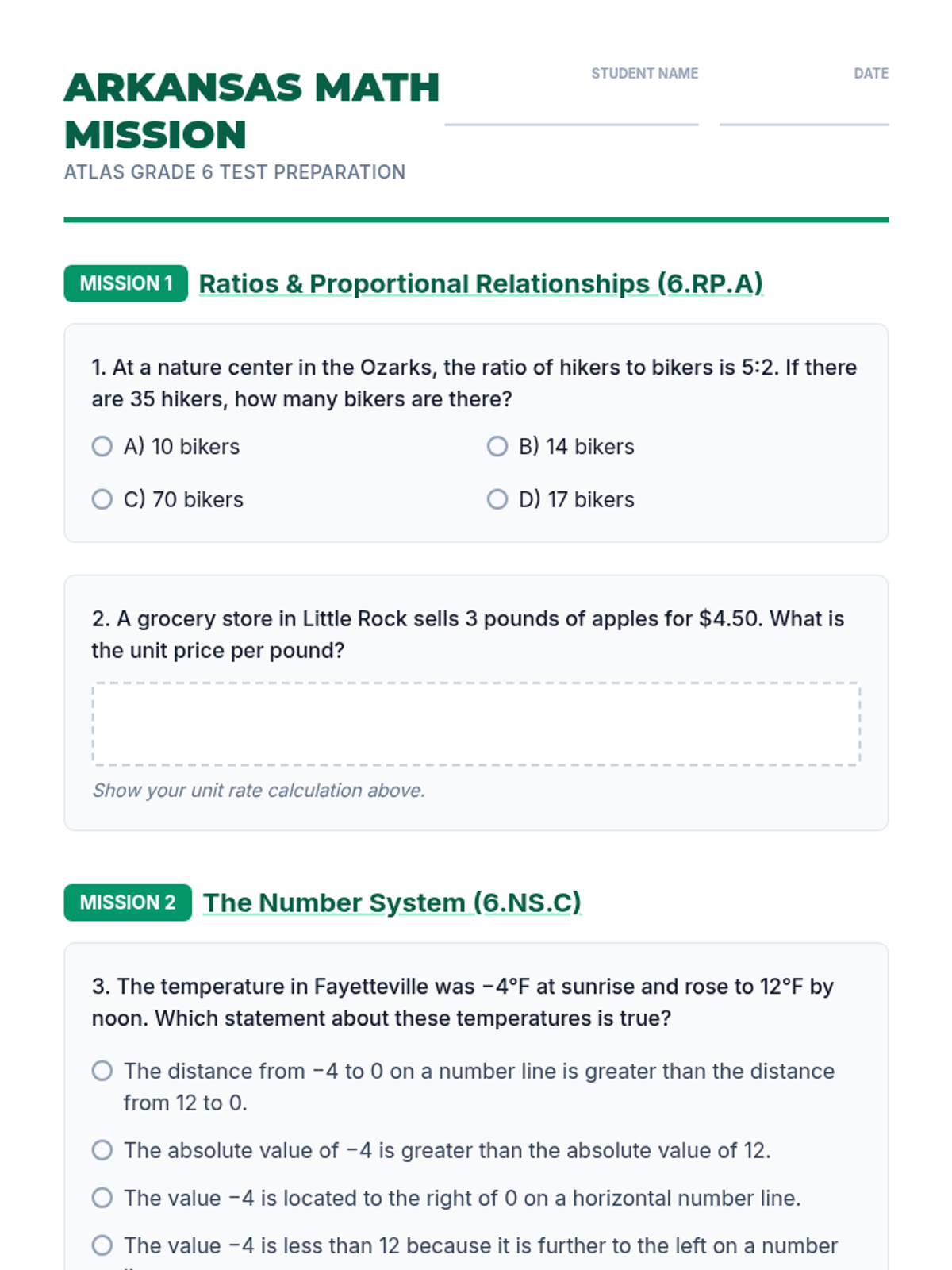 A Grade 6 math practice worksheet designed for Arkansas ATLAS test preparation. Features problems across five core domains: ratios, number systems, algebra, geometry, and statistics, using Arkansas-themed contexts and ATLAS-style question formats. Improved with axis labels for the coordinate plane and better page break management.