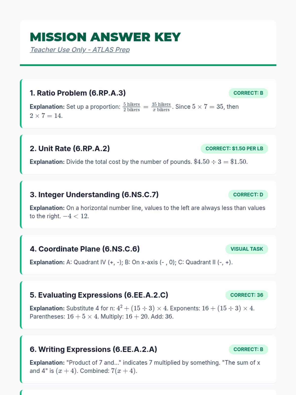 A teacher-facing answer key for the Grade 6 Arkansas Math Mission worksheet. Includes correct answers for all problems, standards alignment, and step-by-step explanations for pedagogical support.