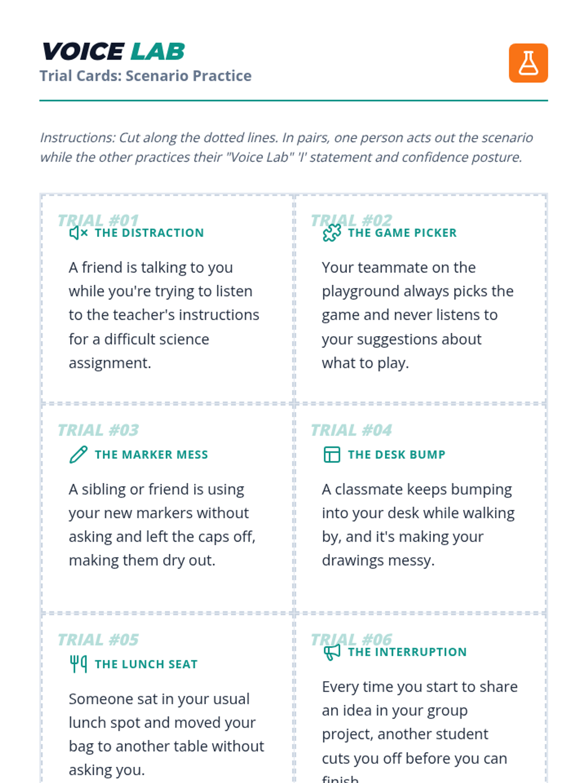 A set of printable role-play scenario cards for the 'Voice Lab' activity, featuring common 5th-grade social challenges to practice using 'I' statements.