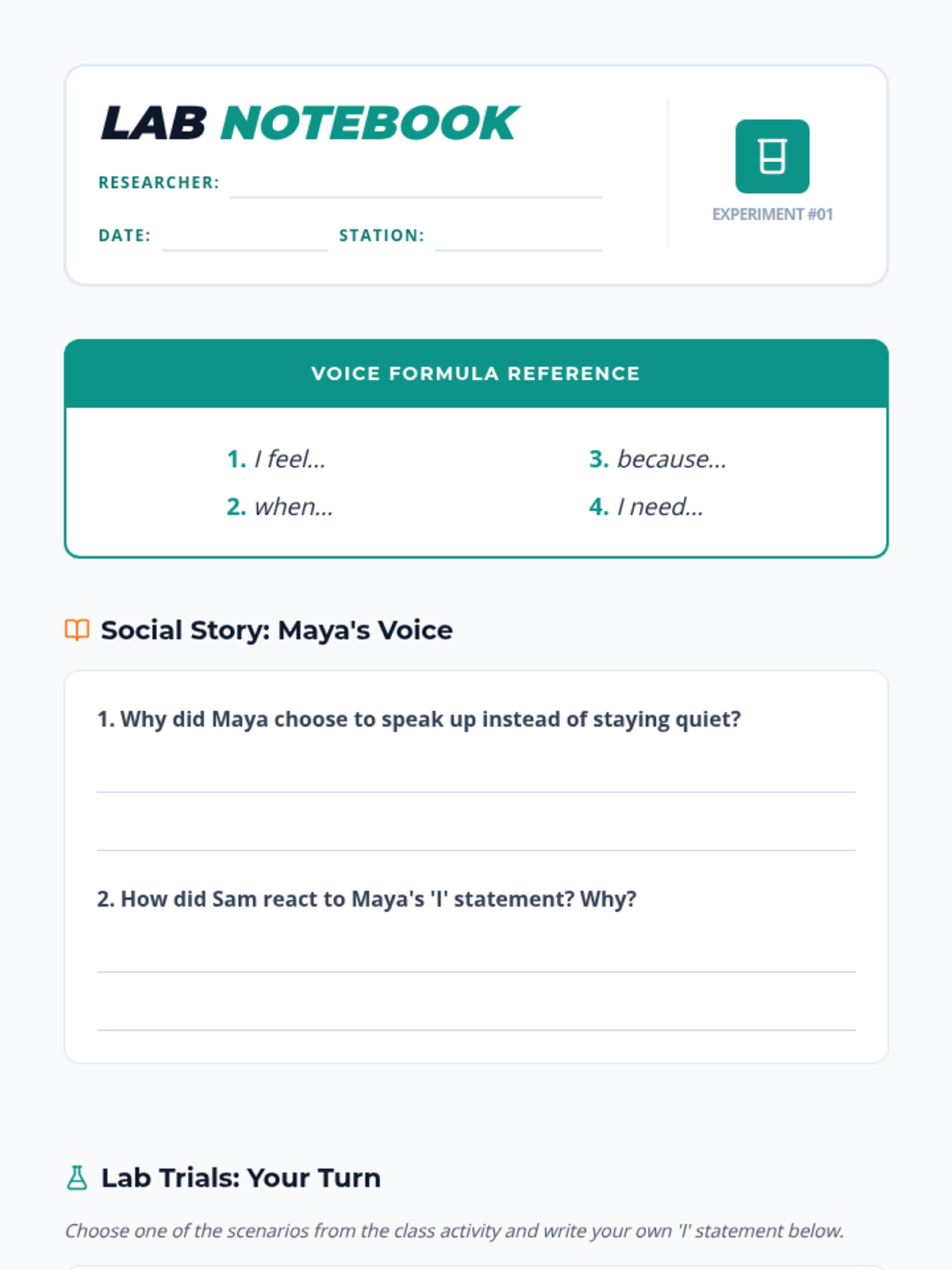 A lab-themed reflection worksheet for students to practice writing 'I' statements, reflect on the 'Maya's Voice' social story, and perform a self-assessment of their confidence levels.