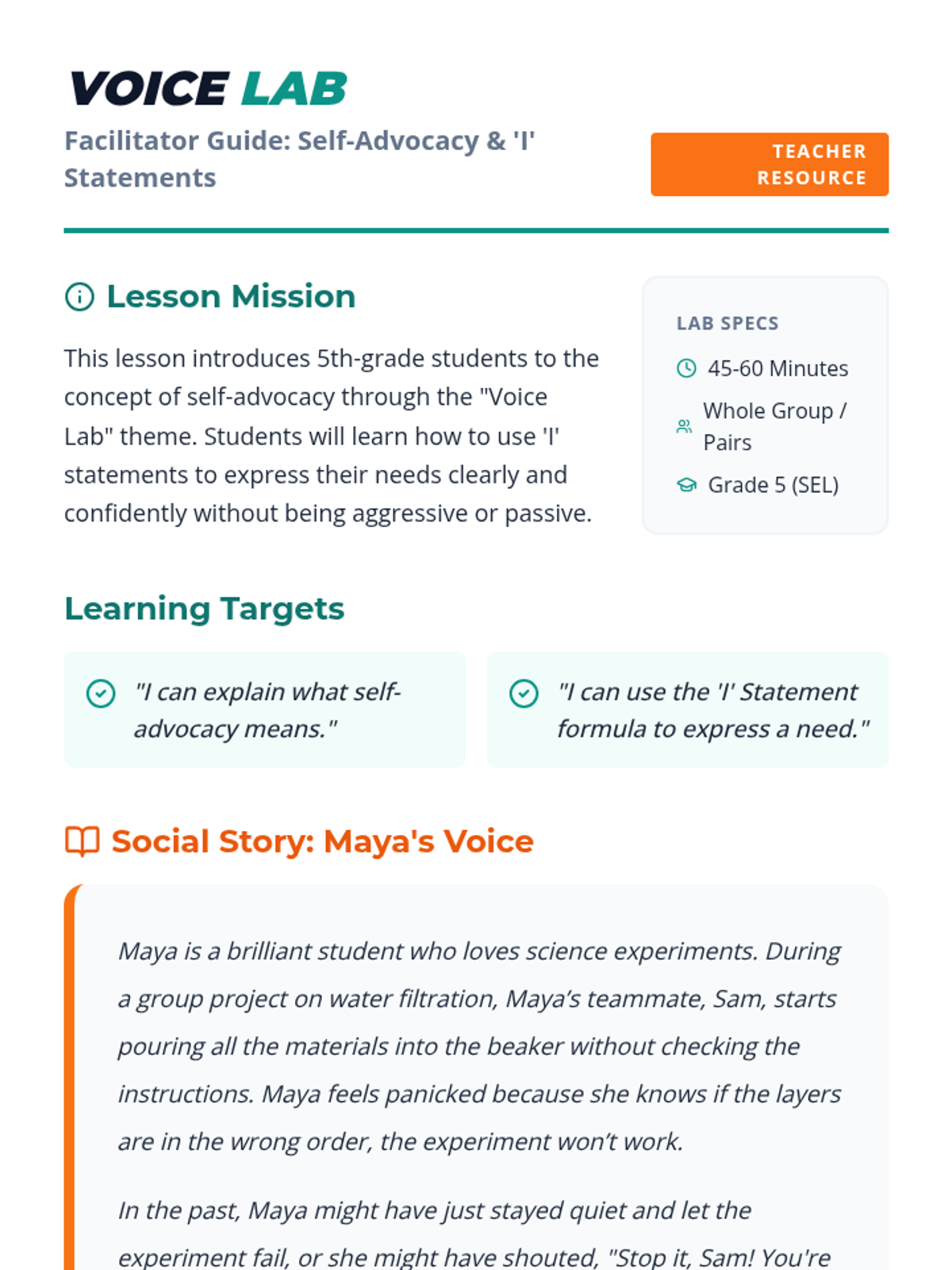 A detailed facilitator guide for teachers, including the full text of 'Maya's Voice' social story, discussion prompts, lesson objectives, and role-play scenarios.