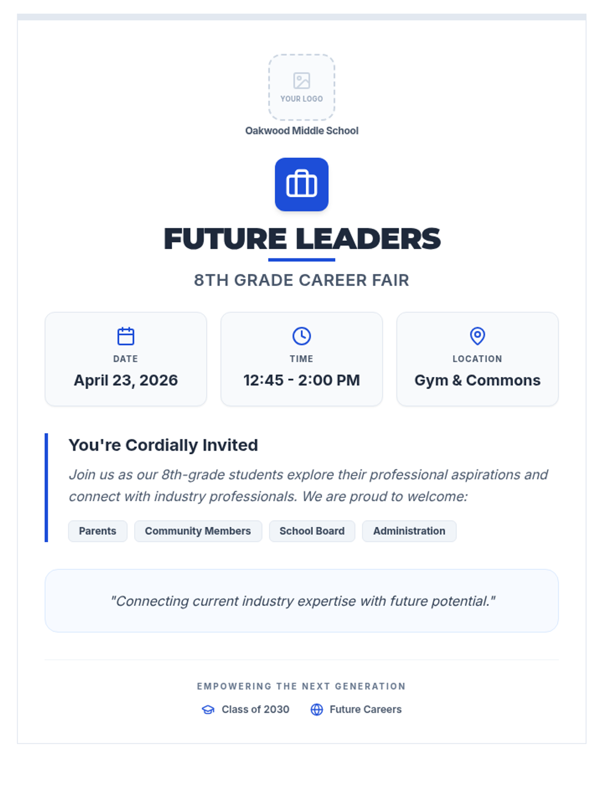 A modern and professional flyer for an 8th-grade career fair, featuring clear event details, a clean visual hierarchy, and a dedicated school logo placeholder. All guest check-in instructions have been removed as requested.