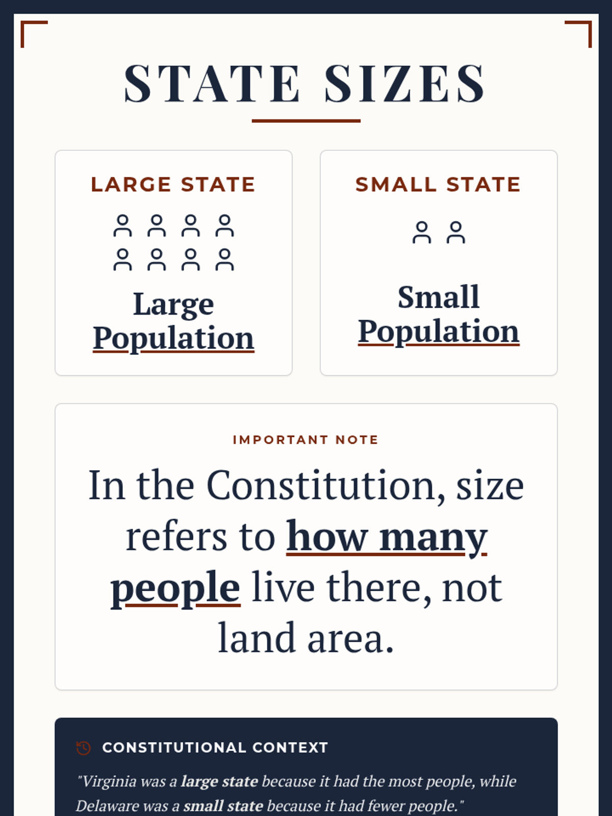 A vocabulary poster clarifying that 'large' and 'small' states refer to population size, not physical land area, in the context of the Constitutional Convention.