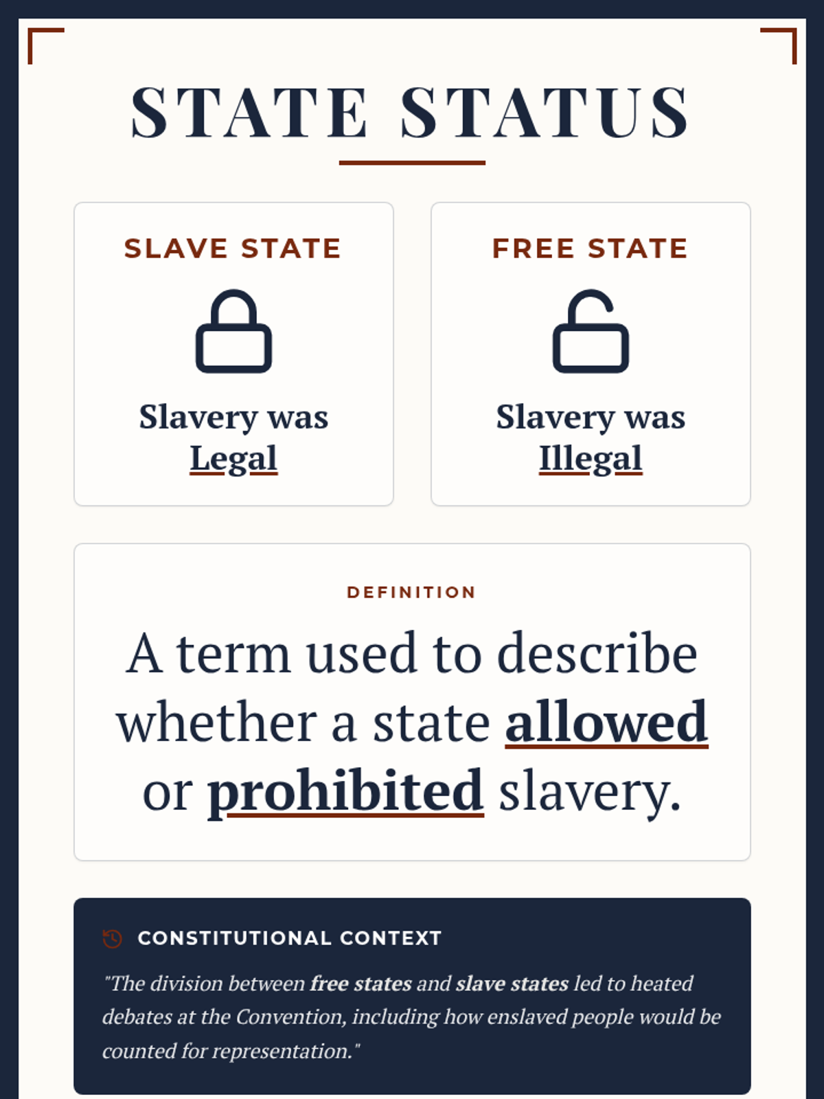 A vocabulary poster illustrating the difference between 'free states' and 'slave states' in the context of the Constitutional Convention.
