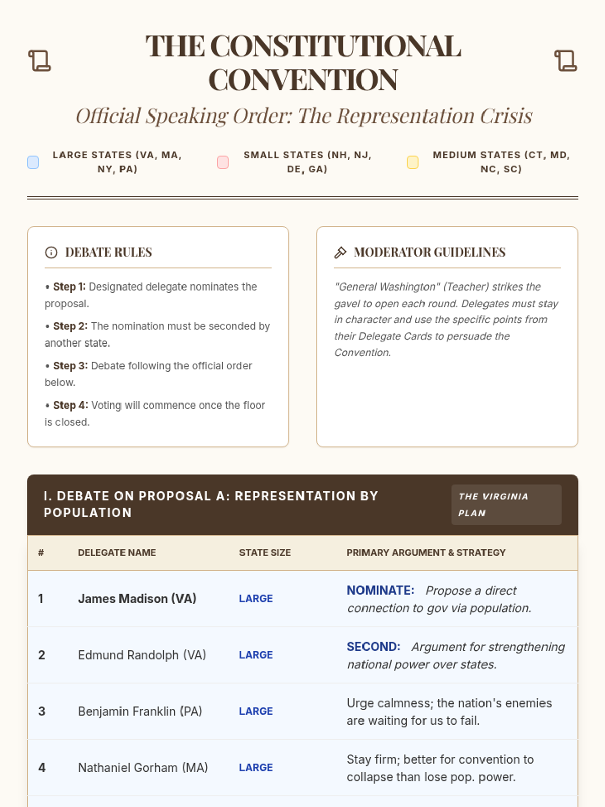 A structured speaking order for a Constitutional Convention simulation, organizing 32 historical delegates into debate rounds for Proposals A, B, and C, culminating in the Great Compromise.