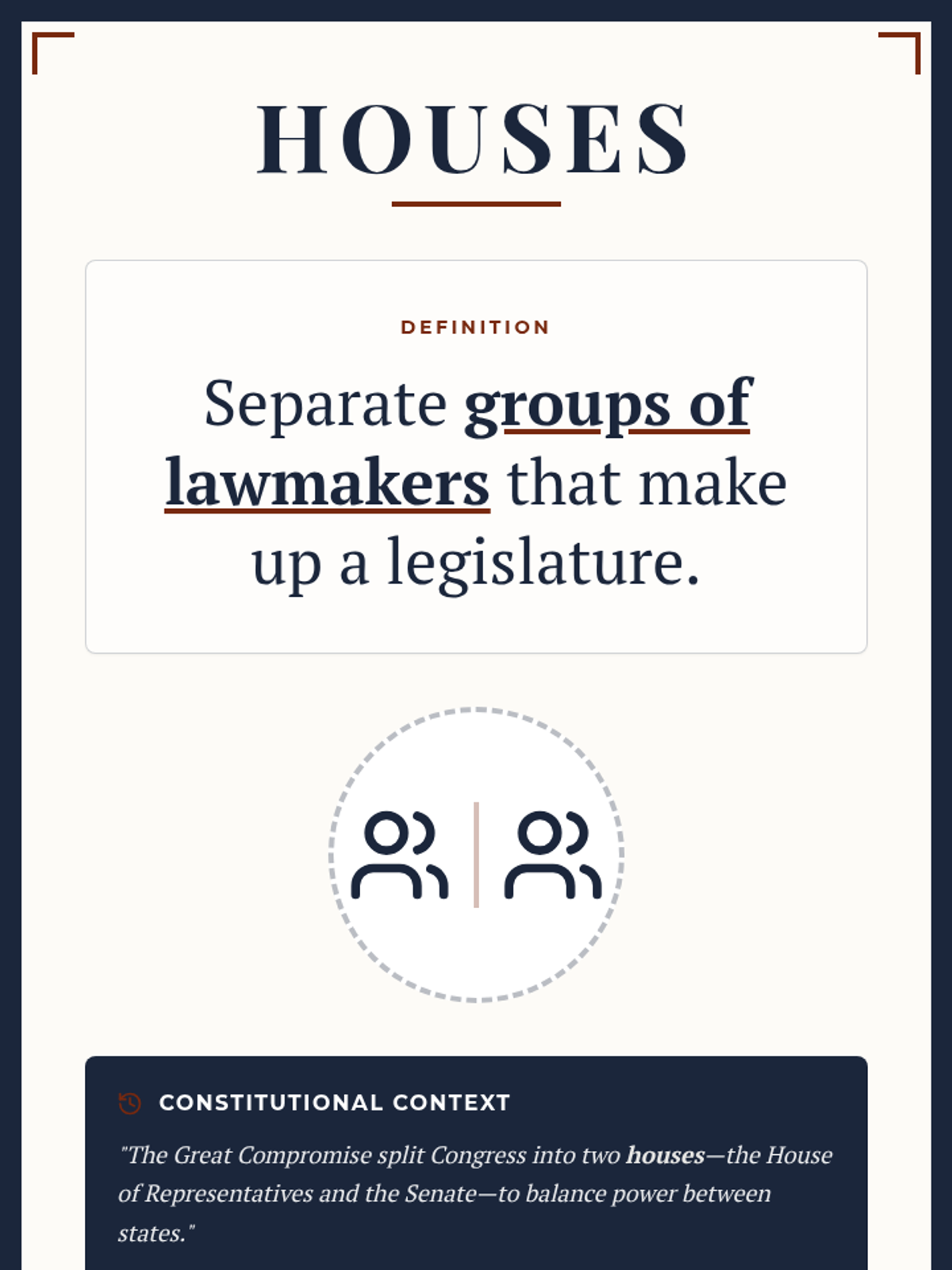 A vocabulary poster defining 'houses' as separate groups of lawmakers in a legislature, within the context of the Constitutional Convention.