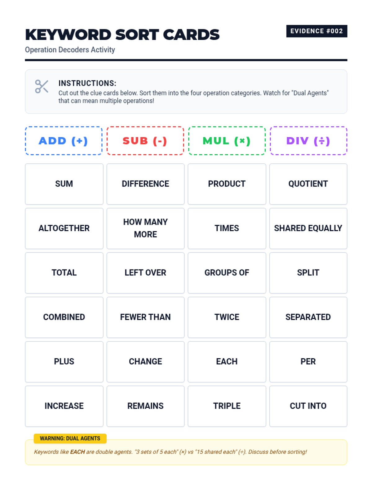 A printable set of keyword cards and operation headers for a hands-on sorting activity. Students categorize common mathematical vocabulary into addition, subtraction, multiplication, and division buckets.