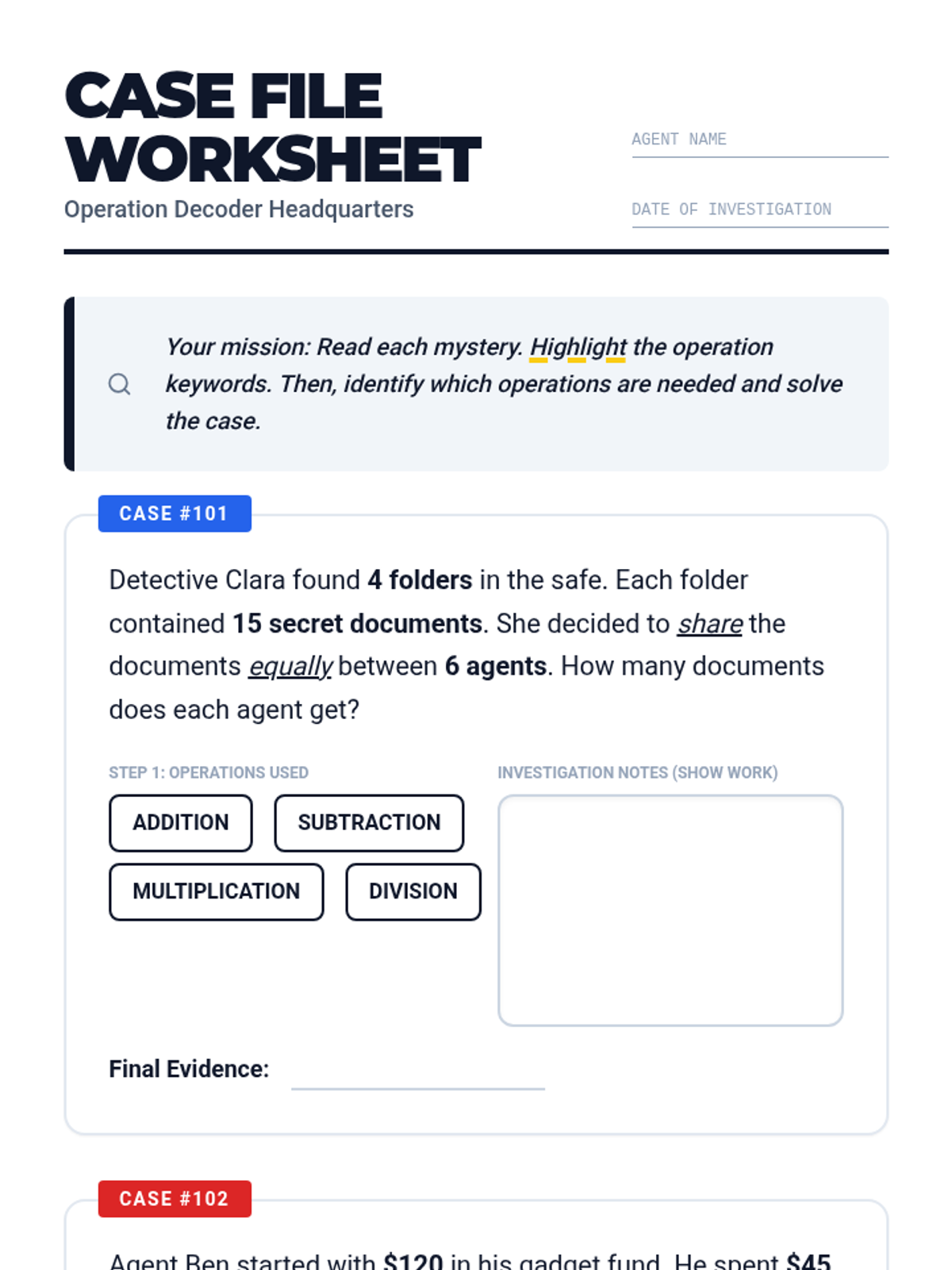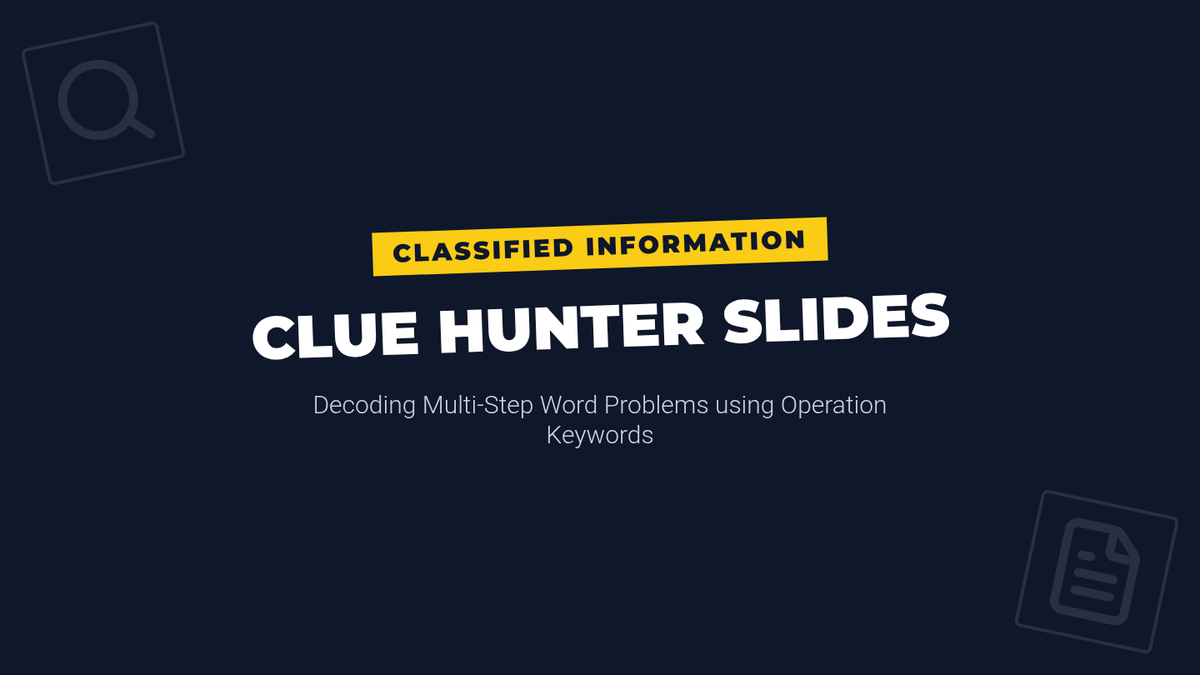 A visual slide deck introducing the "detective" theme for solving multi-step word problems. It identifies key vocabulary for addition, subtraction, multiplication, and division, and demonstrates how to sequence operations in complex problems.