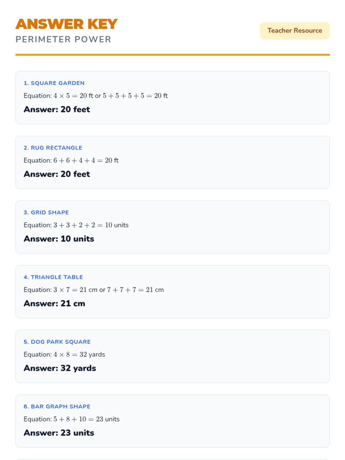 A complete answer key for the Perimeter Power Worksheet, updated to reflect the honeycomb hexagon revision.